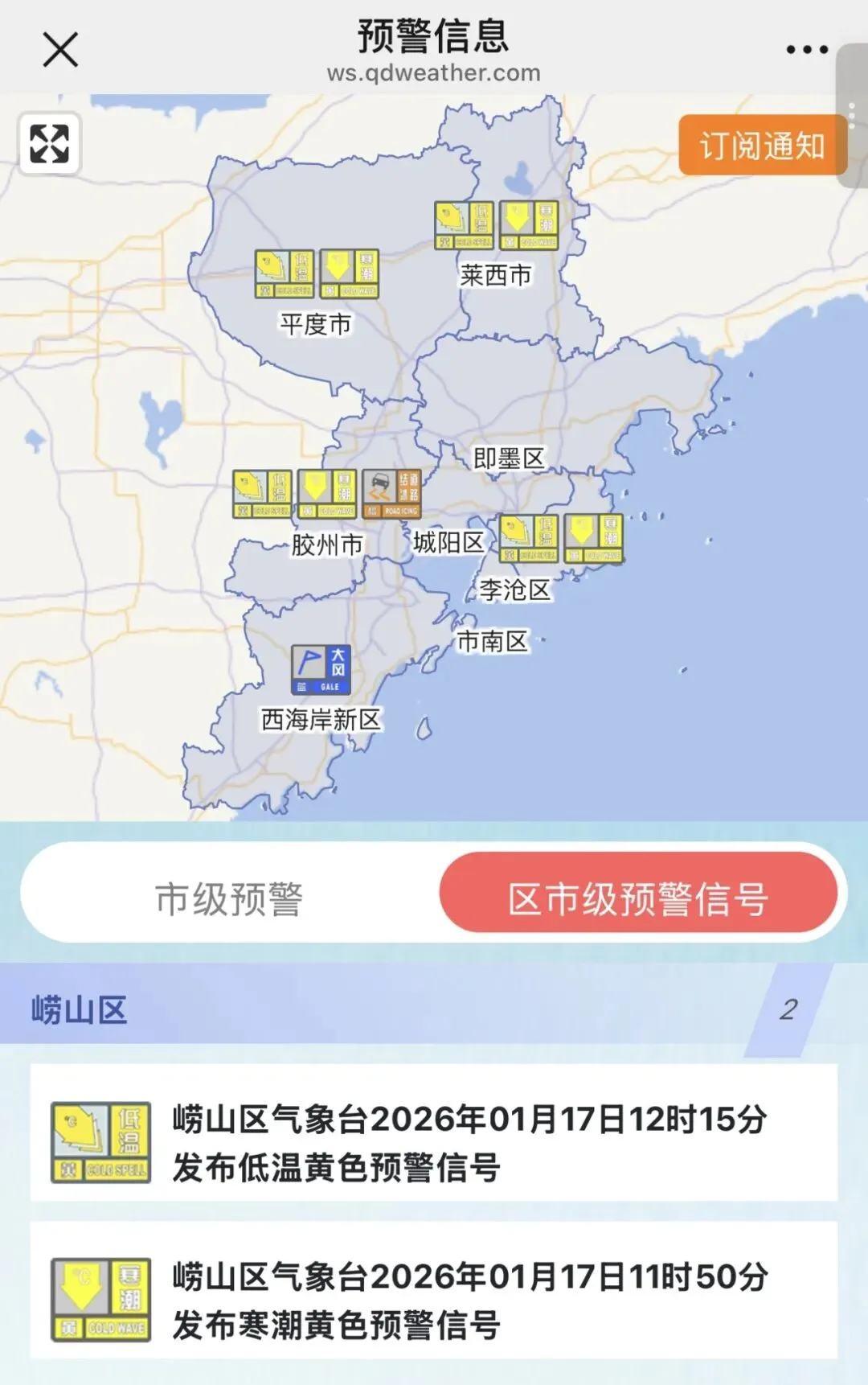 崂山区气象台2026年01月17日11时50分、12时15分分别发布寒潮黄色预警和低温黄色预警信号。
