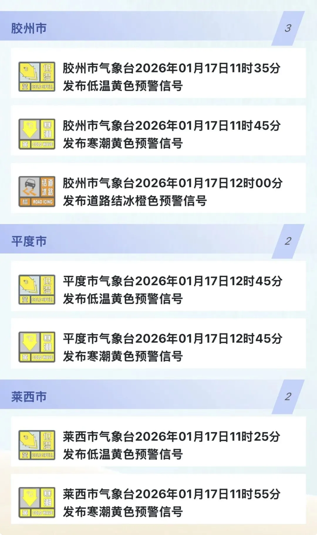 胶州市气象台2026年01月17日11时35分、11时45分、12时00分分别发布低温黄色预警、寒潮黄色预警、道路结冰橙色预警信号。