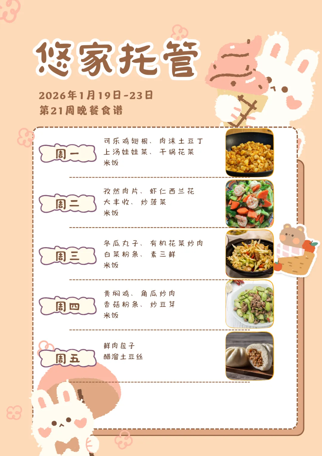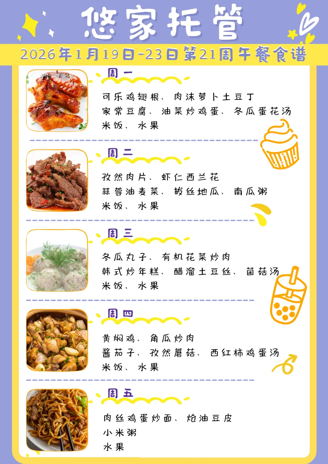 亲爱的家长朋友们,每到周末,是不是都在好奇孩子下周在托管能吃到哪些美食?别急!悠家托管每周食谱准时上线,我们始终坚持 “新鲜选材、科学搭配、营养均衡” 的原则,让孩子在享受舌尖美味的同时,补足成长所需的能量,吃得开心、家长放心!