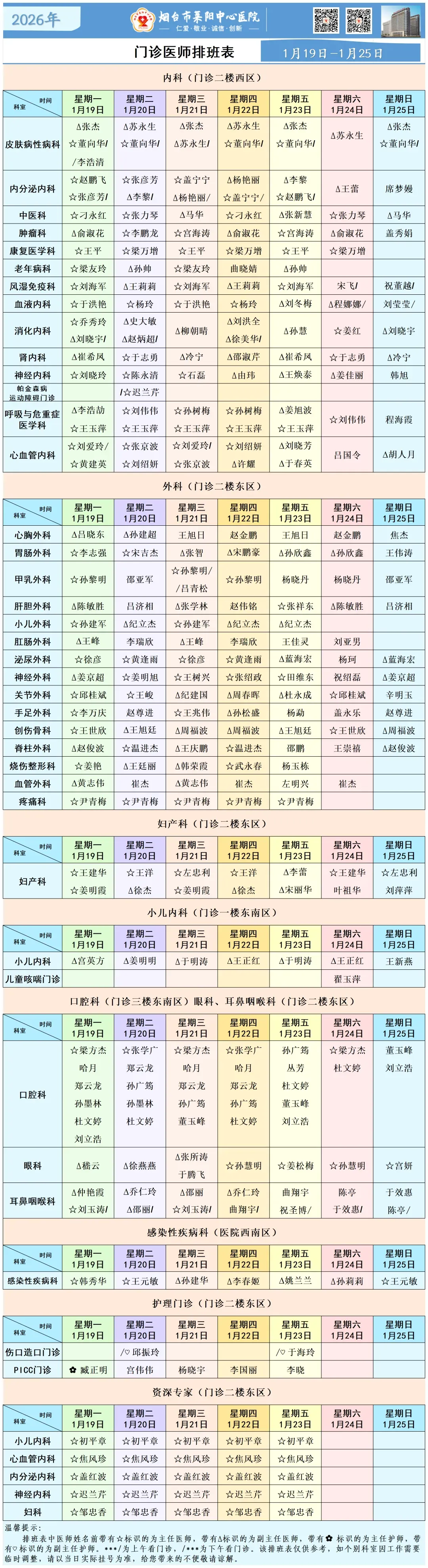 为了更好的方便市民朋友就诊,烟台市莱阳中心医院每周推出《门诊医师排班表》,市民朋友可根据需求查看医师坐诊时间,预约挂号,错峰就诊。就诊时请携带身份证、医保卡、就诊卡或电子健康卡。天气变化,注意增减衣物,戴好口罩,保持间隔距离。