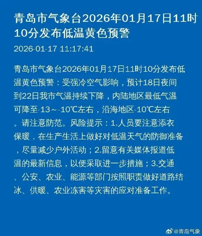 青岛市气象台2026年1月17日11时10分发布低温黄色预警:受强冷空气影响,预计18日夜间到22日青岛市气温持续下降,内陆地区最低气温可降至-13~-10℃左右,沿海地区-10℃左右。