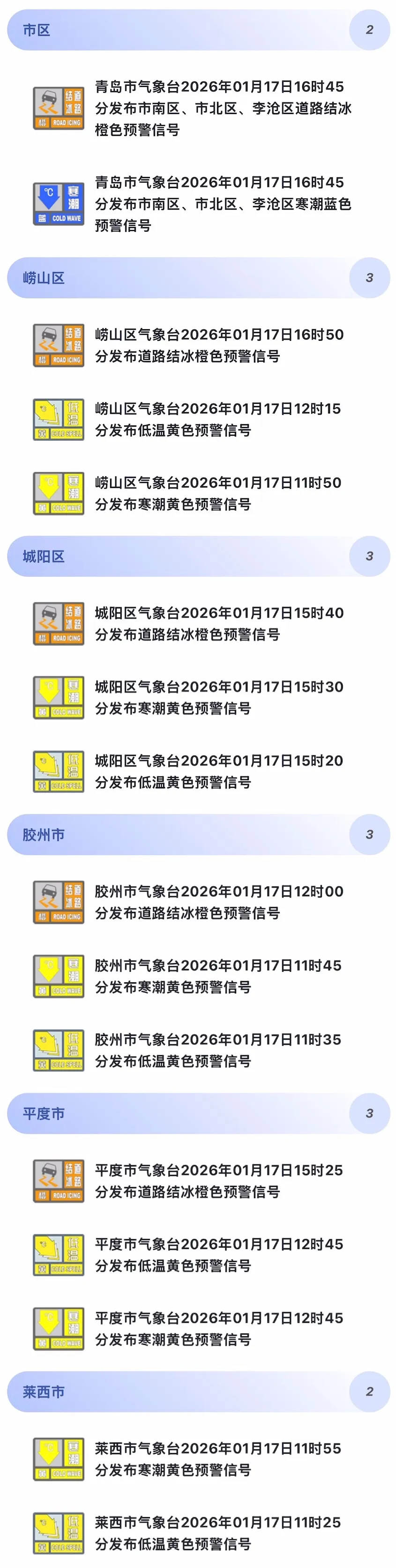青岛市气象台2026年1月17日11时10分发布道路结冰橙色预警:预计18日凌晨到19日,青岛市将有中到大雪,由于地表温度较低,将出现对交通有很大影响的积雪和道路结冰,请注意防范。