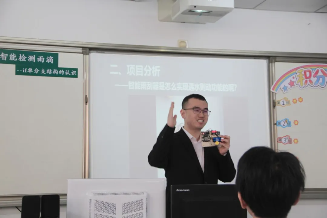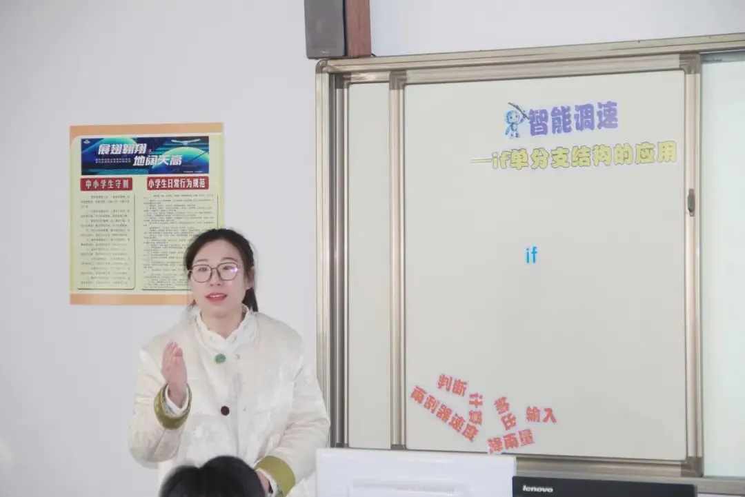 胶州市北关小学鲁延灏老师《智能检测—if单分支结构的认识》,以生活中常见的智能雨刮器为真实情境,聚焦“遇水则动”核心功能,通过“检测条件我来做”、“遇水则动”等梯度任务,引导学生理解掌握if单分支结构的含义与编程应用。学生在模拟开发“智能雨刮器系统”的过程中,不仅理清了“条件-结果”的核心逻辑,熟练运用关系运算符构建判断条件,更直观感受编程技术服务生活、保障行车安全的实用价值,为后续探究“雨量调节转速”等进阶功能奠定基础。