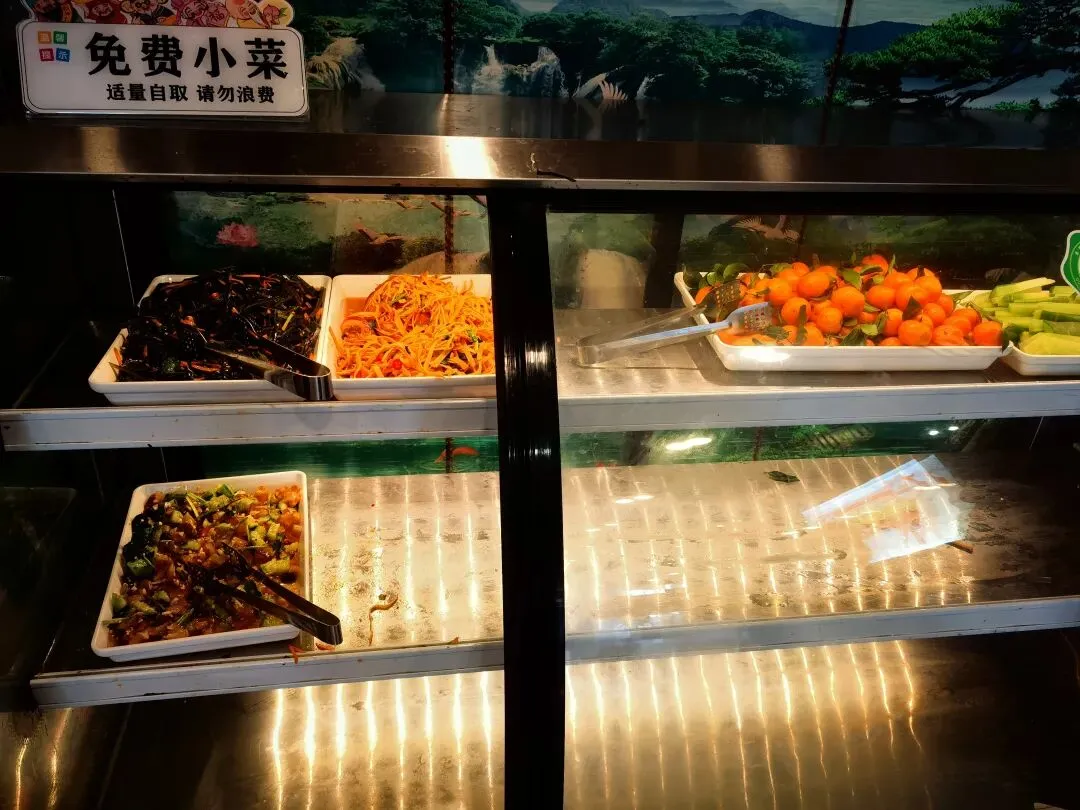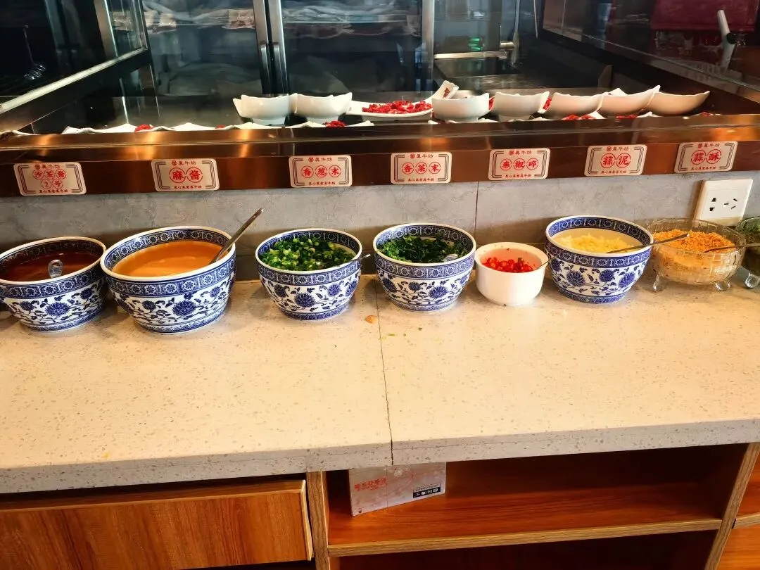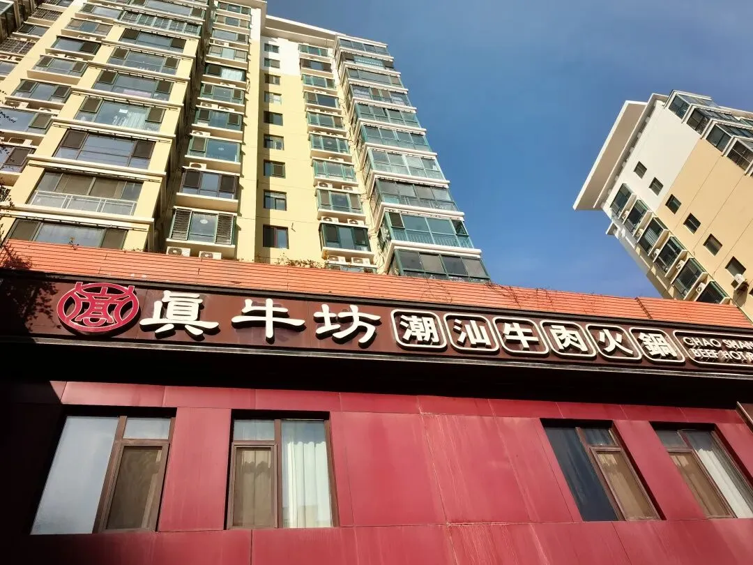 真牛坊潮汕牛肉火锅在辽阳东路温哥华花园的底商,是一家已经开了十几年的老店。店很大,上下两层,一楼是卡座,二楼都是包间。能在这个非餐饮聚集区干这么长时间,必有它的独到之处。我对潮汕牛肉火锅的印象,主要是来自于广州的经历。2020年现代渠道北京团队到广东帮助他们开拓广州市场,将近十个人的团队,都是能吃能喝的棒小伙,一天要跑四五十家店,很辛苦,晚上我们就去吃潮汕牛肉火锅。在帝都的时候都吃铜锅涮肉,到了广州体验一下风格完全不同的潮汕牛肉火锅,也是一种独特的体验,兄弟们都吃得很high。支援广州那段时间,算是把潮汕牛肉火锅和猪脚饭吃得淋淋尽致了。进门右首是吧台,吧台里面是小料台,各种小料还是比较齐全的。在广州,潮汕火锅的小料都比较少,真牛坊这绝对是按照北方人吃火锅的需求来配备小料了,从芝麻酱、牛肉酱到花生脆,再到辣椒油、韭花酱等,根据自己的需求来调即可。小料台里面是操作间,可以看到师傅在切肉,刀工是真好!小料台旁边是冷藏柜,里面放着拌好的各种凉菜,还有水果。今天的凉菜是海带丝、干豆腐丝和黄瓜皮冻,味道都很赞,尤其是它的黄瓜皮冻,黄瓜清脆,皮冻Q弹,太好吃了!