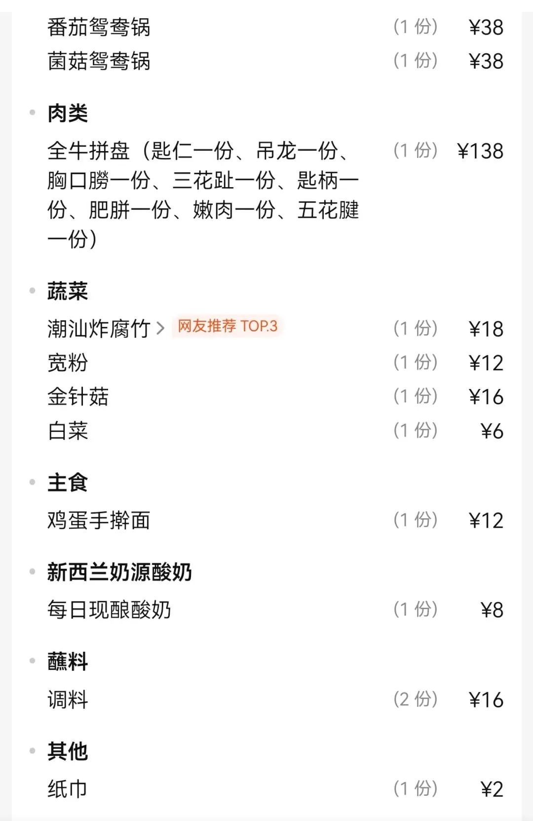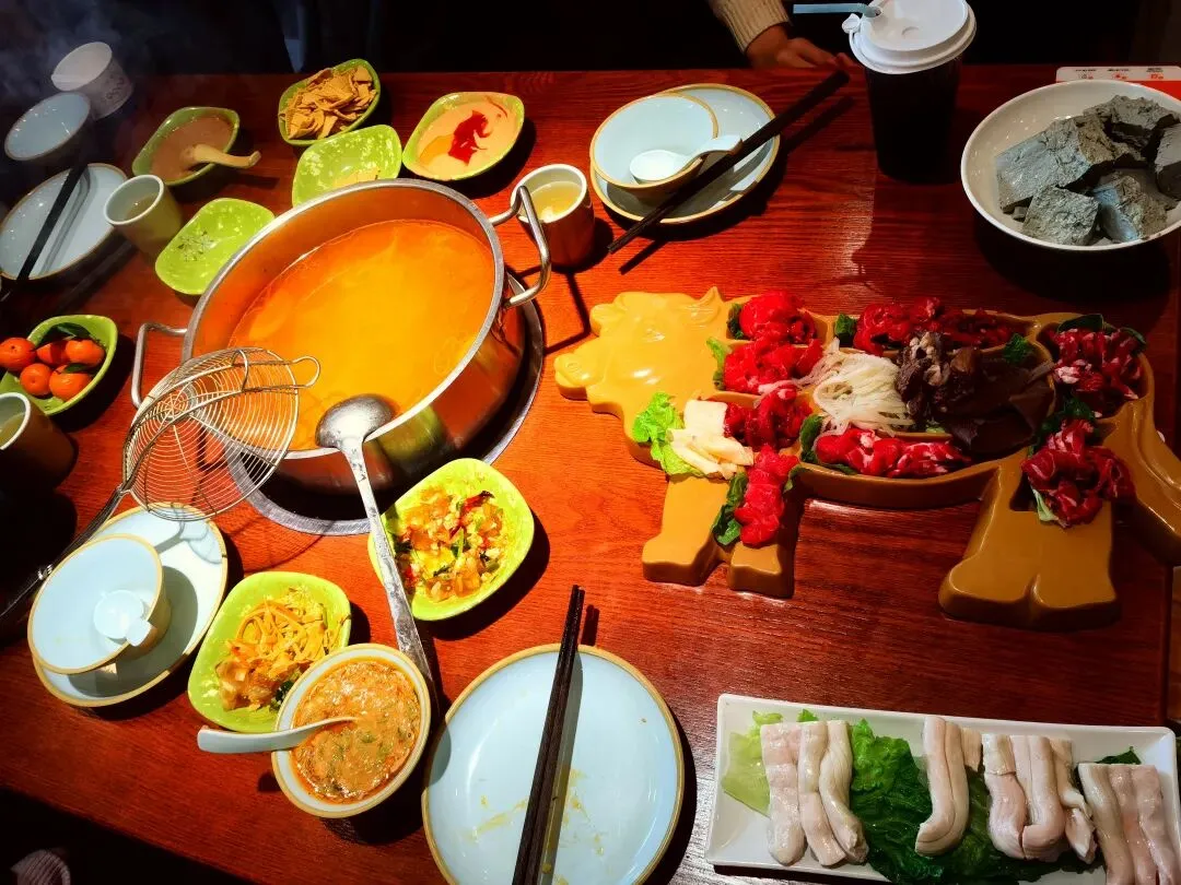 先在大众点评上购买了一个双人套餐,里面含一个全牛拼盘、四种菜和一份面,其余的再单点即可。考虑到老人和孩子的口味需求,锅底要了一个番茄的,其实辣锅要更好一些。这个全牛拼盘是把八种食材放在一个牛型的盘子里,挺有特色。八种食材分别是匙仁、吊龙、胸口朥、三花趾、匙柄、嫩肉、五花腱和肥胼。除了胸口朥需要煮三分钟外,其余的只需要在小笊篱里煮几秒钟即可食用。口感确实各不相同,各有特色,值得逐一品尝一下。我们又单点了牛骨髓、牛百叶、毛肚、木耳和豆腐,牛百叶和毛肚涮了很好吃,但牛骨髓着实一般。事实证明,牛骨髓最好吃的方式还是烤,涮了吃确实有些浪费了。它的豆腐是黑豆做的,豆香很浓,比较嫩又不会散花,味道相当不错。木耳和白菜都是火锅中比较经典的食材了,从来不会让人失望。炸腐竹涮了以后,再蘸自己的调料,味道丰富又不油腻。套餐加单点的太多了,实在吃不了,最后金针菇和宽粉我们打包带走了。