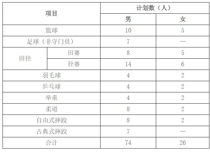 招生项目:篮球、足球(非守门员)、田径、羽毛球、乒乓球、举重、柔道、摔跤(自由式、古典式),分项目分性别拟招生计划如下表所示(最终计划以上级主管部门批复的为准)。