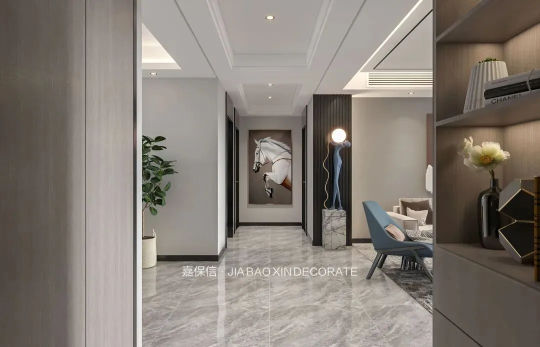 玄关是归家的第一站,先要解决人们进出门的收纳。两侧定制储物柜,藏纳日常琐碎。大理石地砖倒映着筒灯的柔光,抬眼便是现代风格之家的精致。