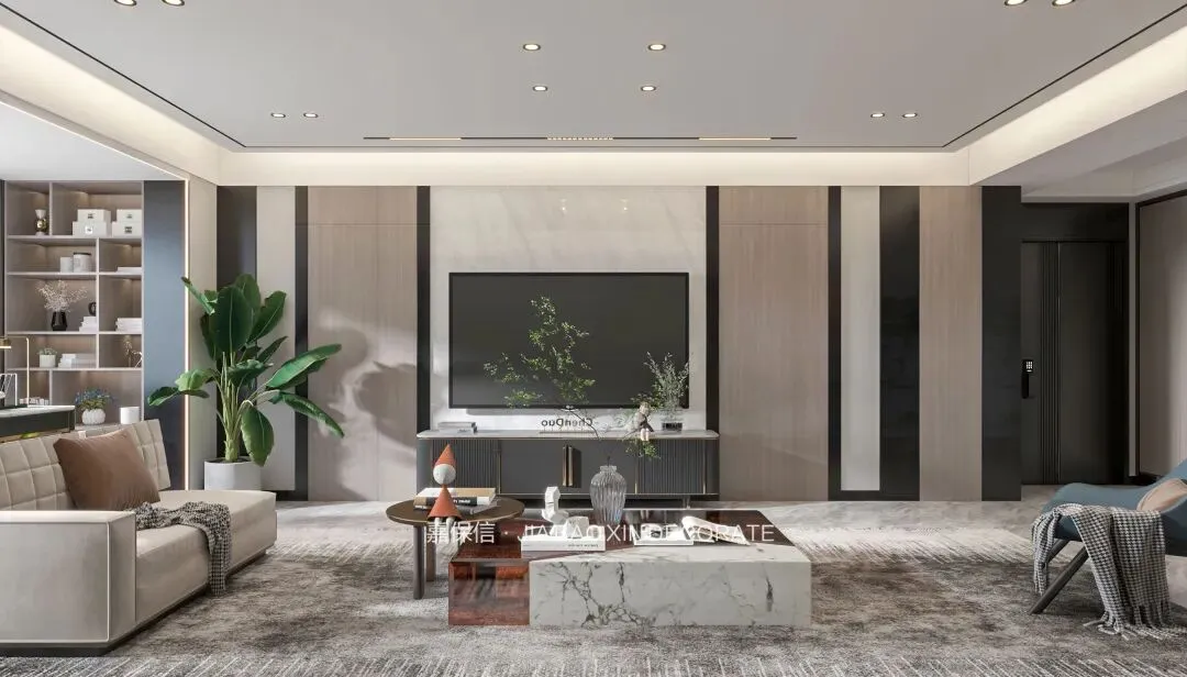 客厅围绕电视墙展开,木饰面与大理石纹装饰板的组合层次分明,黑色竖向线条更显简洁大气。悬浮吊顶藏入射灯等隐匿光源,既满足了照明需求,又为空间注入呼吸感。