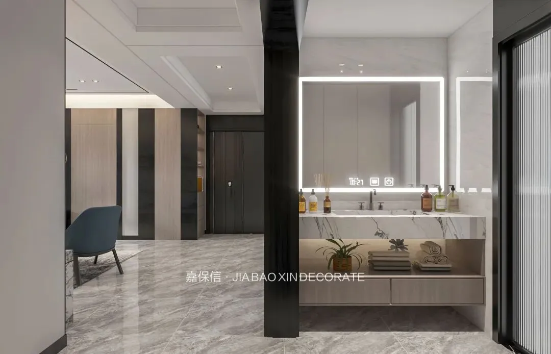 洗漱区外置与长虹玻璃门结合,实现干湿分区。镜柜加入LED灯带,兼顾收纳与柔光照明。大理石洗手池与墙地砖巧妙呼应,形成连贯统一的美感。悬空木质储物柜同时满足展示与收纳需求。