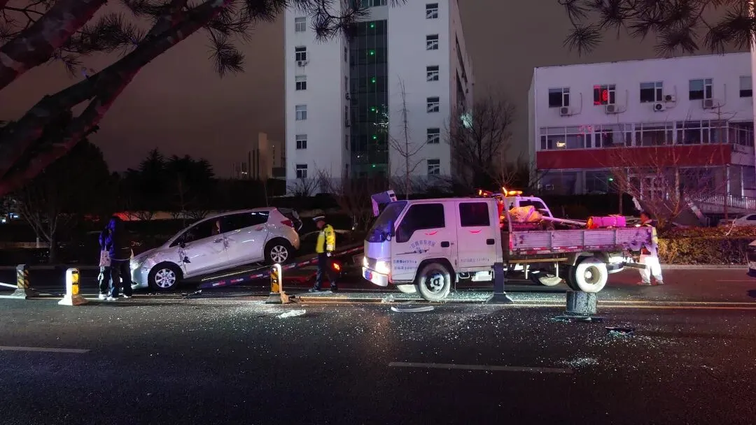 刚刚,烟台路与淄博路南50米,一辆轿车撞向护栏。车辆前风挡破碎,看起来像是被护栏穿透,现场一片狼藉。但愿驾驶员没有受伤。