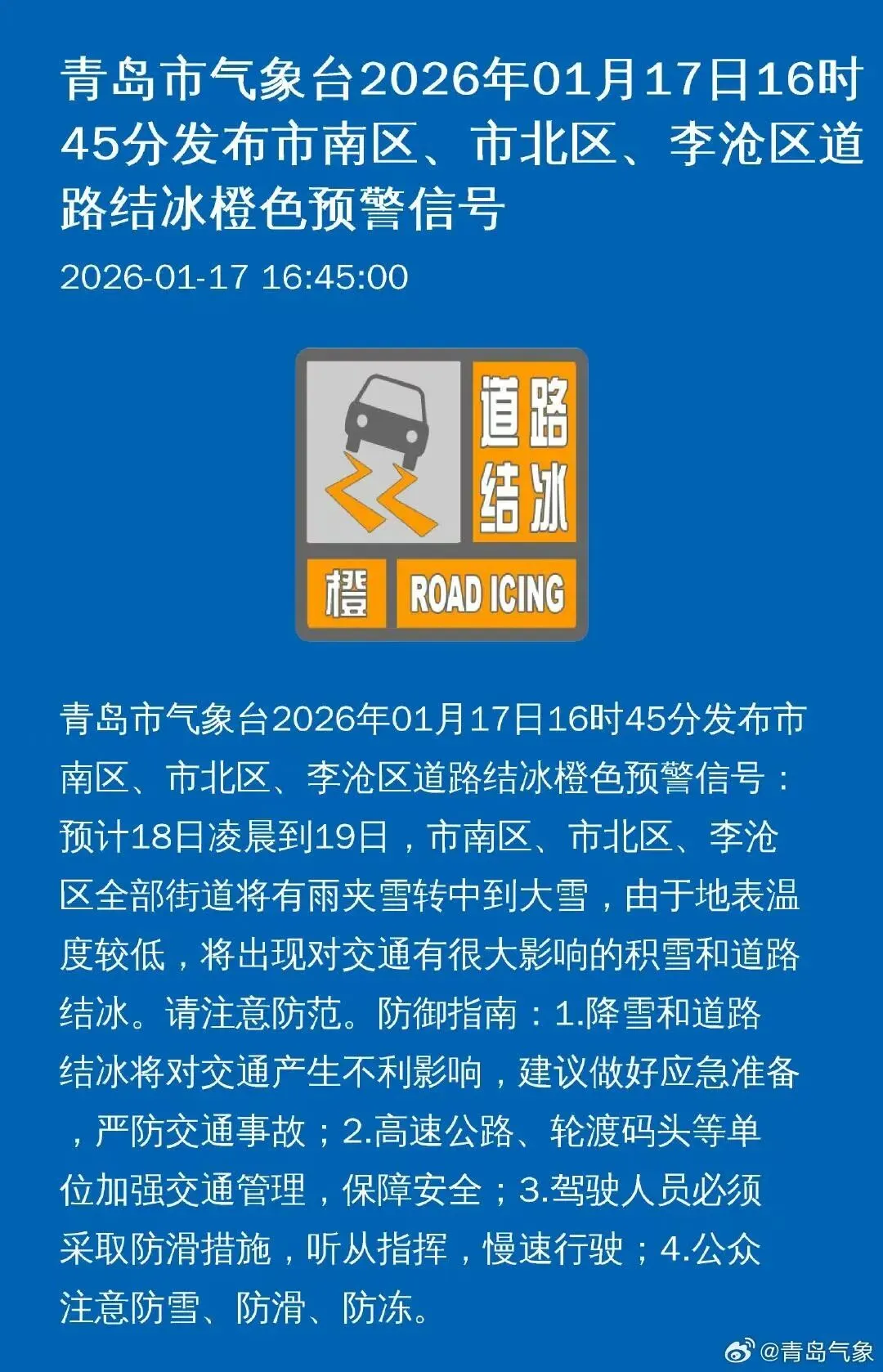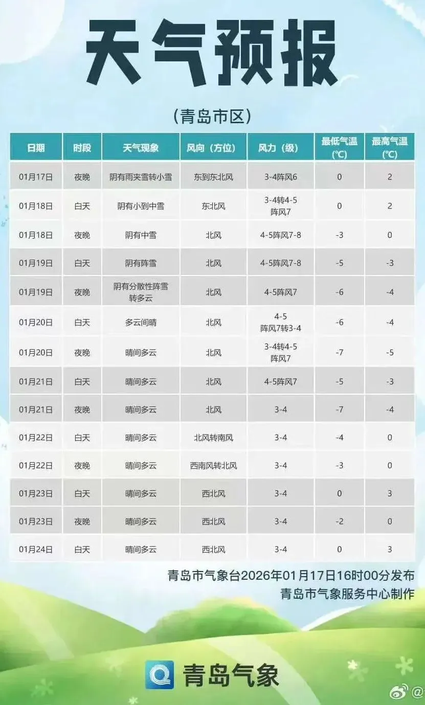 【青岛市区】今天夜间,阴有雨夹雪转小雪,东到东北风3到4级阵风6级,明天白天,阴有小到中雪,东北风3到4级转4到5级阵风7级,相对湿度60%—95%,明天最低气温0℃,最高气温2℃。