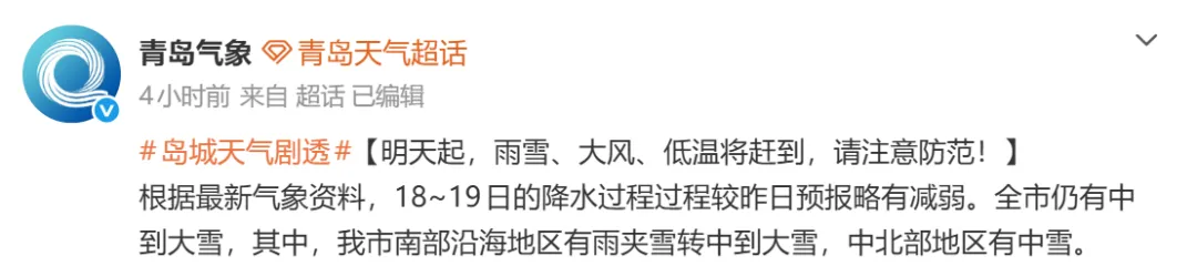 根据最新气象资料,18~19日的降水过程过程较昨日预报略有减弱。全市仍有中到大雪,其中,青岛市南部沿海地区有雨夹雪转中到大雪,中北部地区有中雪。