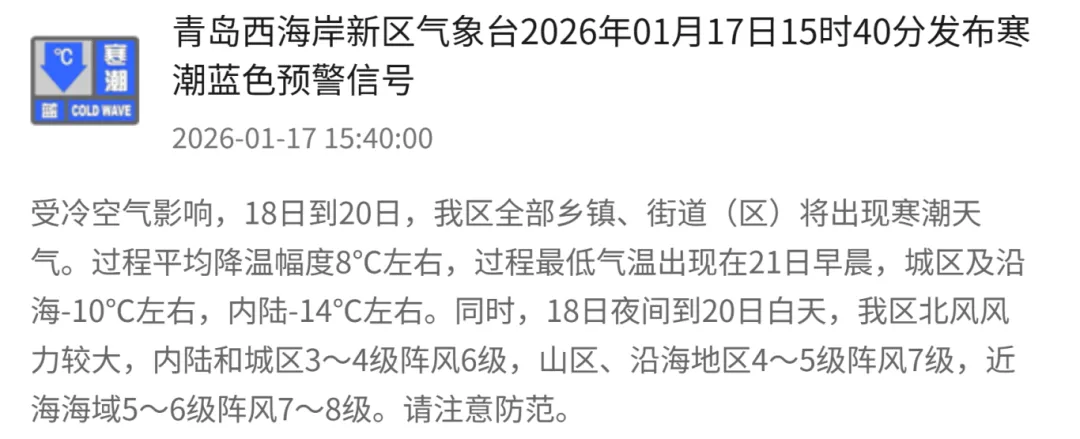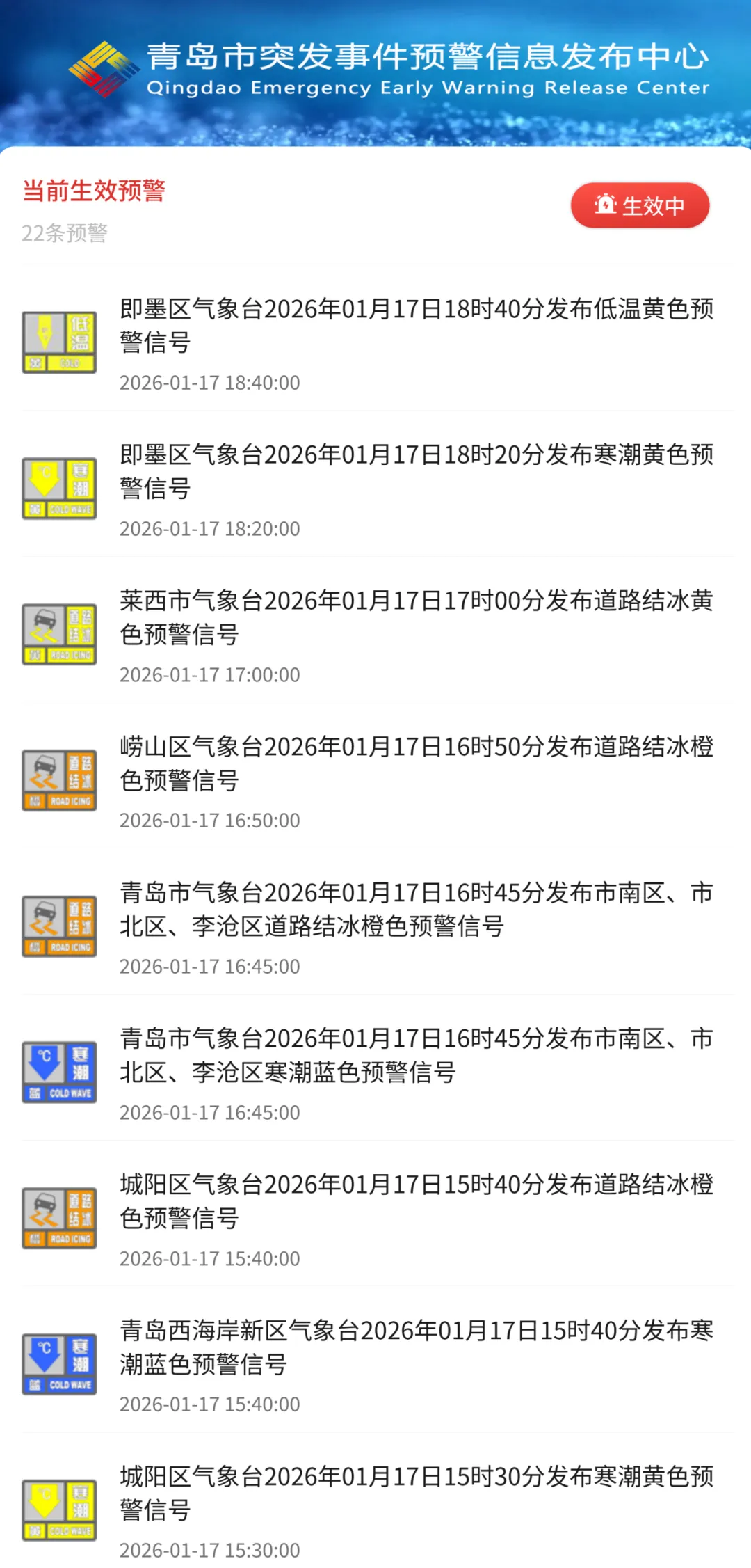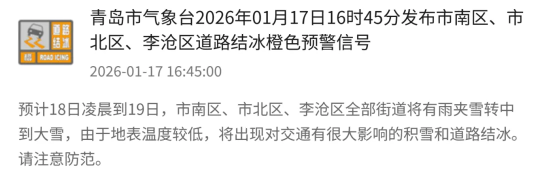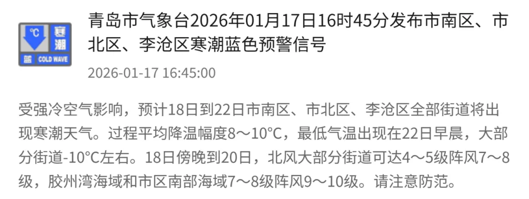 ✅市南区、市北区、李沧区发布道路结冰橙色预警、寒潮蓝色预警:
