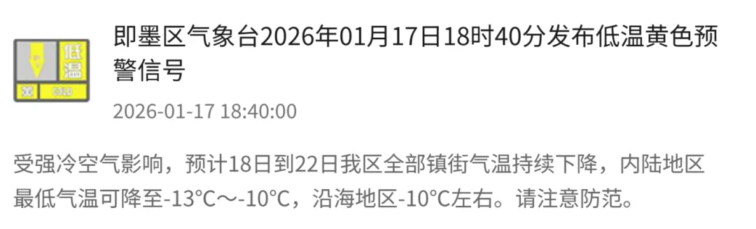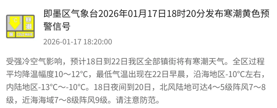 ✅即墨区发布低温黄色预警、寒潮黄色预警: