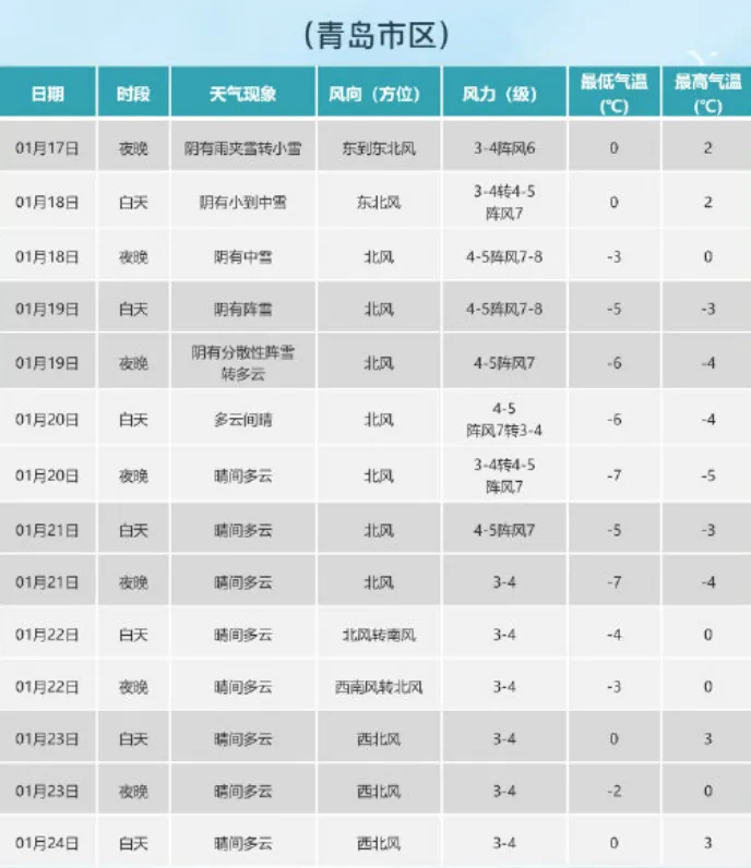 今天夜间到明天白天,阴南部地区有雨夹雪转小到中雪,中北部地区小到中雪,东到东北风,海上5到6级转6到7级阵风8级,内陆3到4级转4到5级阵风7级,明天最低气温-5℃,最高气温4℃。