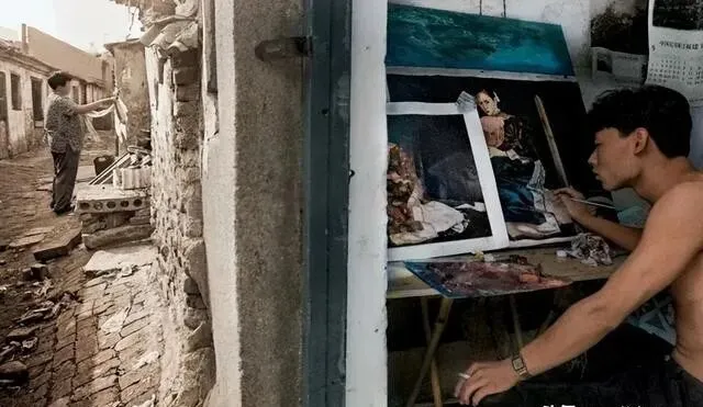 有张照片特别打动我 , 一个男人打着赤膊 , 戴着大手表 , 坐在家门口画油画 , 画得还挺像那么回事。