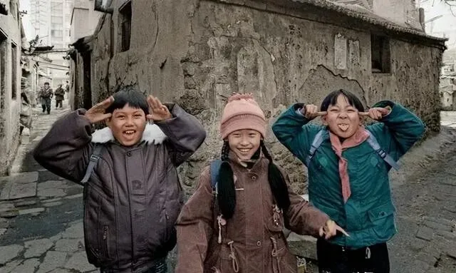 老照片里三个小孩刚放学 , 一个女孩笑得腼腆 , 旁边俩男孩吐舌头做鬼脸 , 背景是破破烂烂的老街。