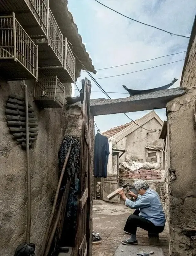 有张照片 , 一个老大爷坐在集体大院门口砍柴 , 穿着蓝衬衫 , 手法麻利得很。
