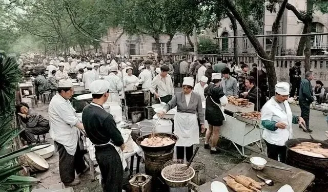 照片里街边全是早餐铺 , 摊主穿白围裙戴厨师帽 , 揉面的揉面 , 炸油条的炸油条 , 井井有条。
