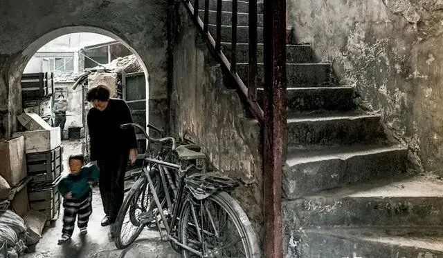 楼梯破旧 , 全是污渍 , 但祖孙俩的神态 , 特别温馨。
