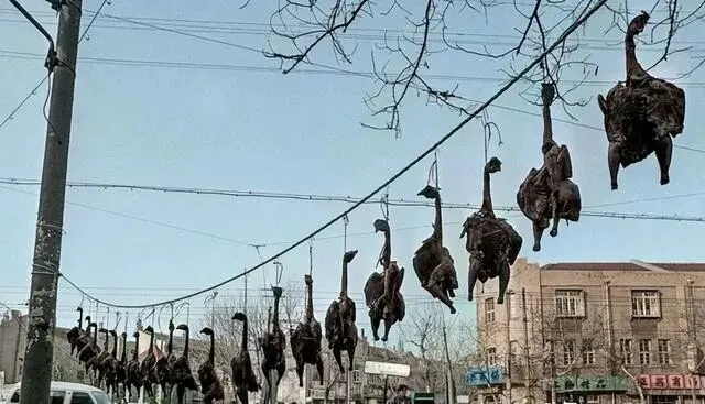 青岛人过年前要晒腊货 , 电线杆之间拉根绳 , 挂满熏好的鸡鸭鹅。