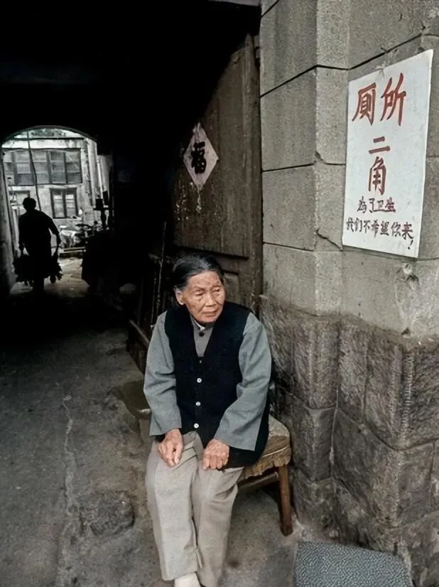 照片里一个老太太守在公厕门口 , 穿得厚厚的 , 套着黑马甲 , 精神头挺好。
