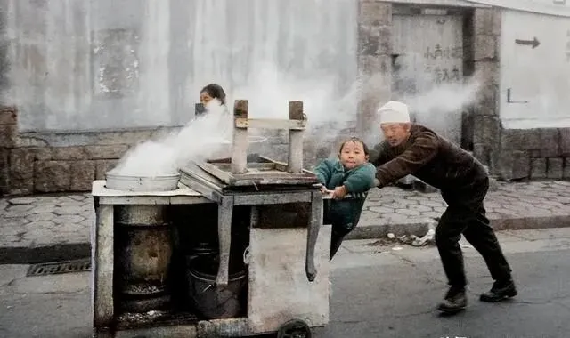 有张照片让我印象特别深 , 一个男人推着早餐车 , 车上锅炉冒着白烟 , 还坐着个穿绿棉袄的小孩 , 懵懵懂懂的。
