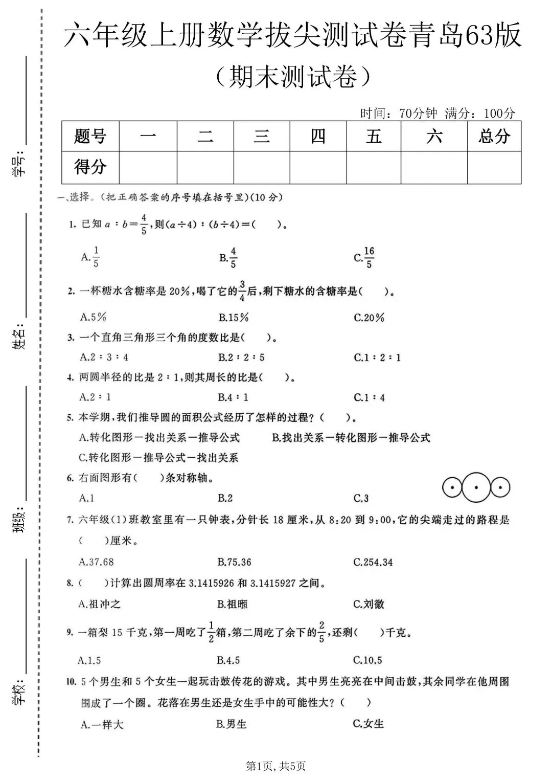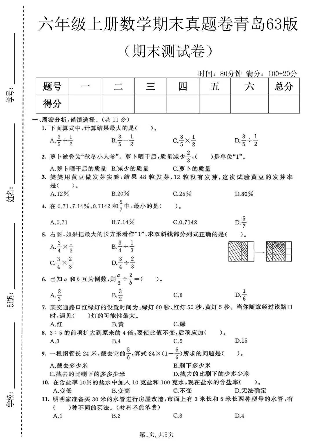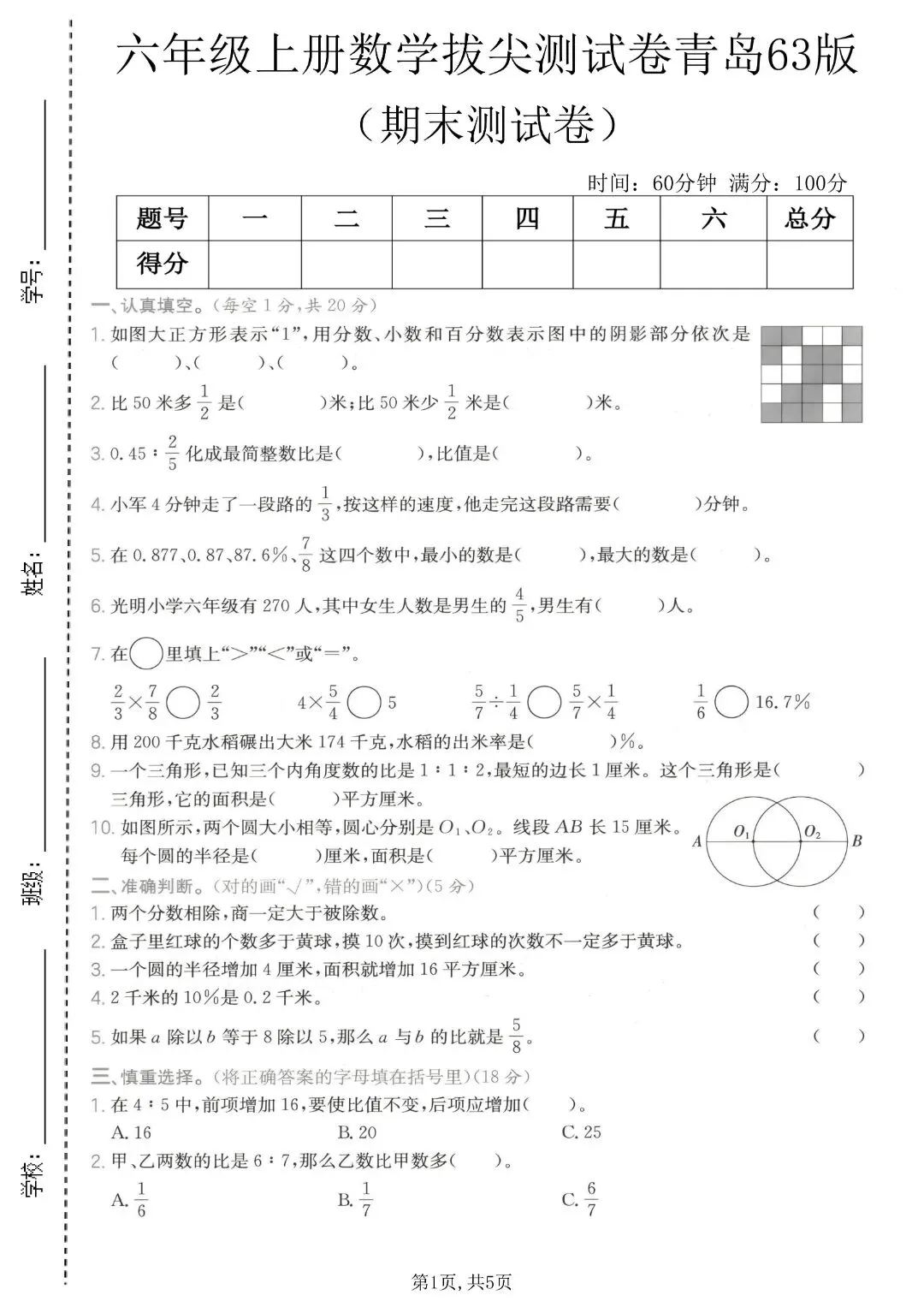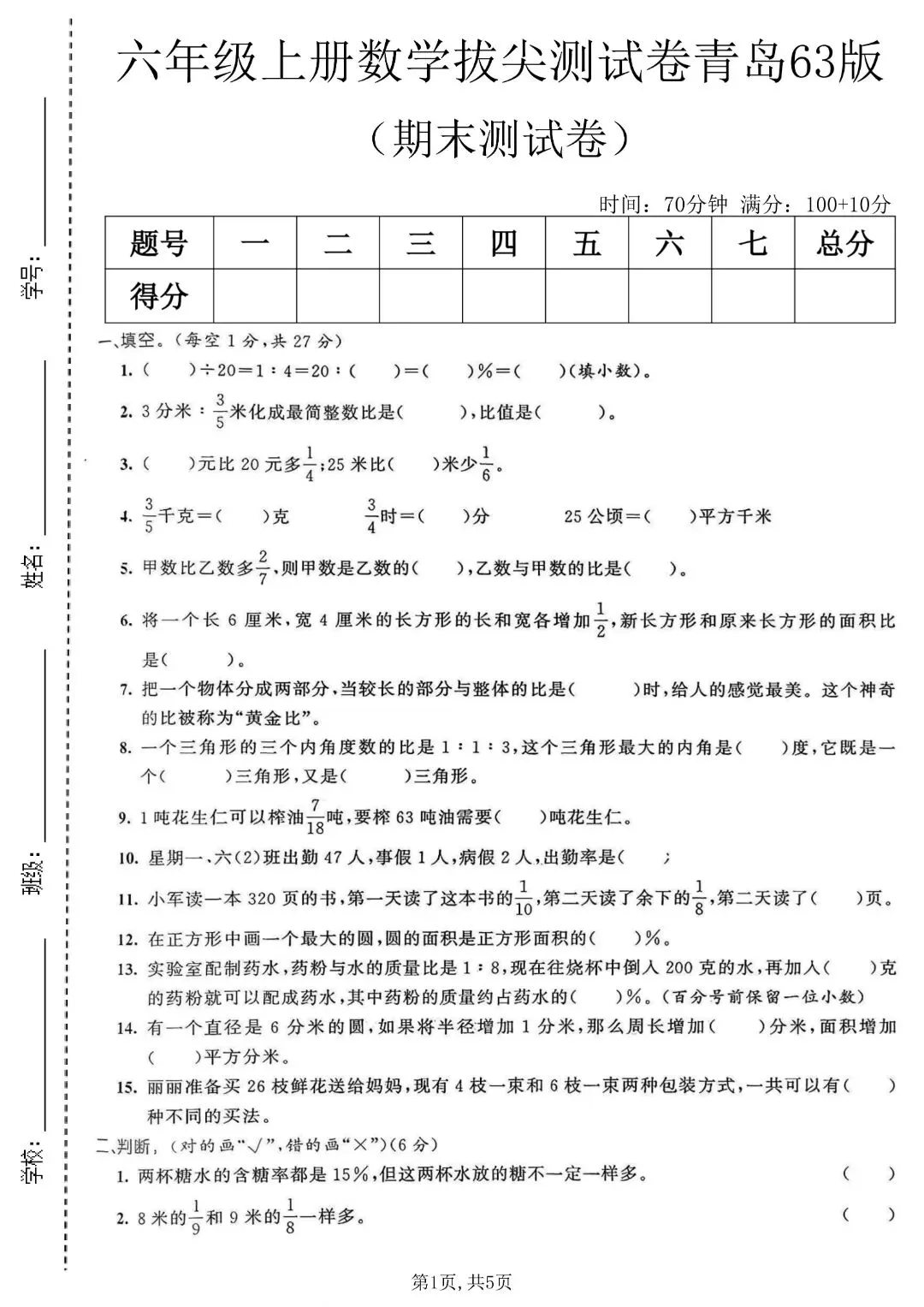 25新青岛63版六年级上册数学《期末测试卷》共12套含答案,完整高清电子版可打印