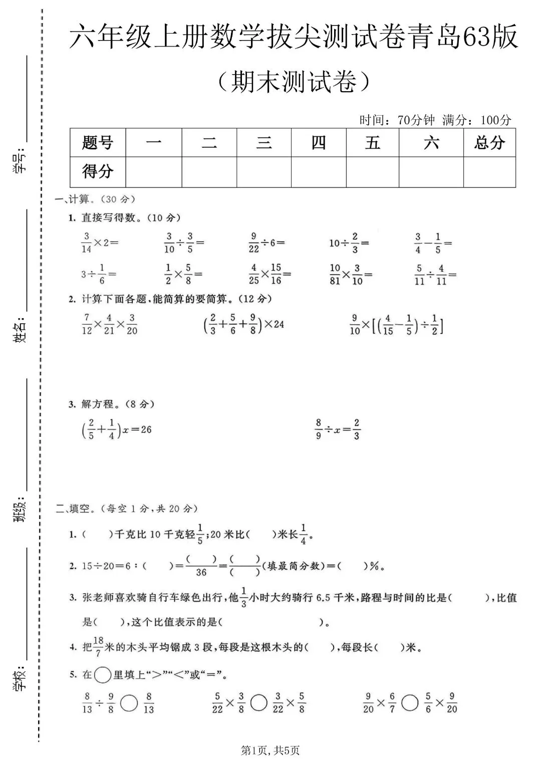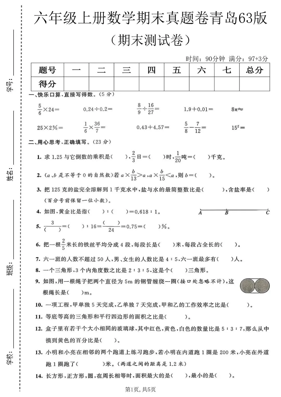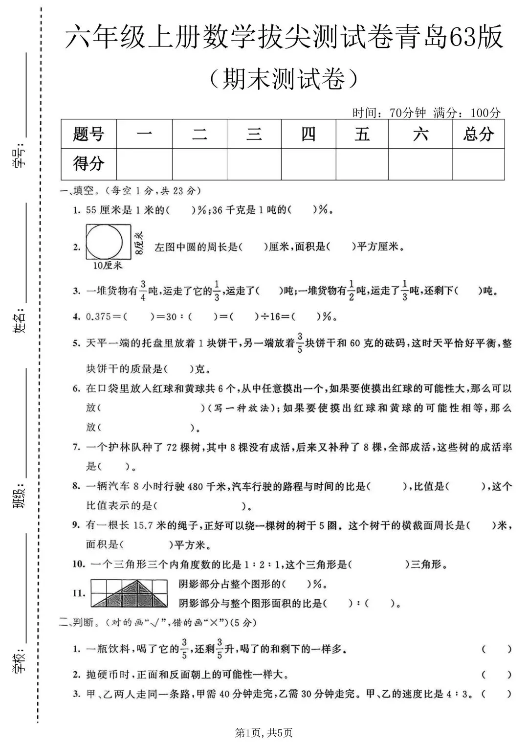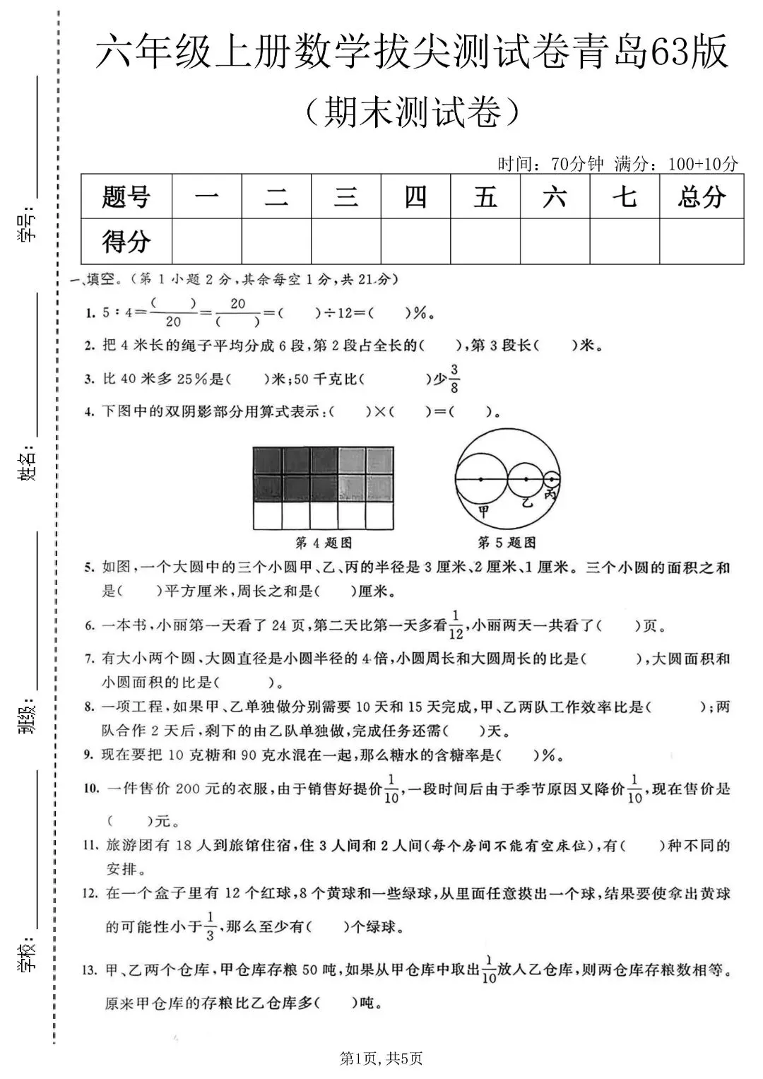 25新青岛63版六年级上册数学《期末测试卷》共12套含答案,完整高清电子版可打印
