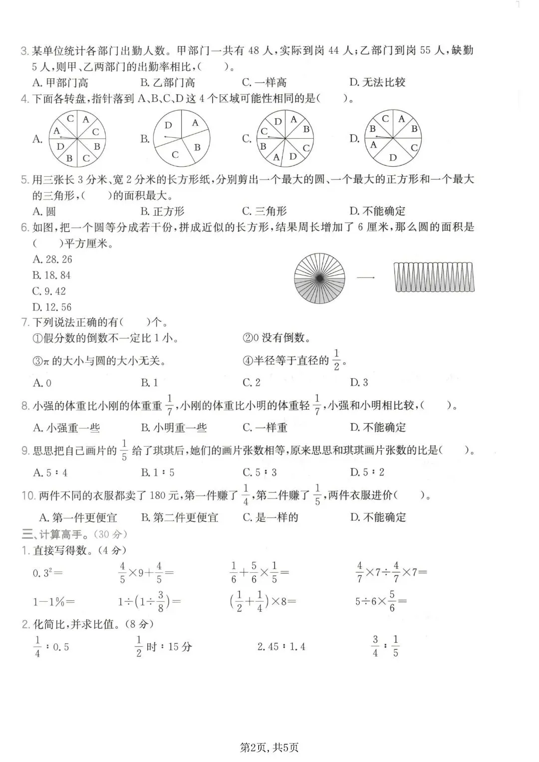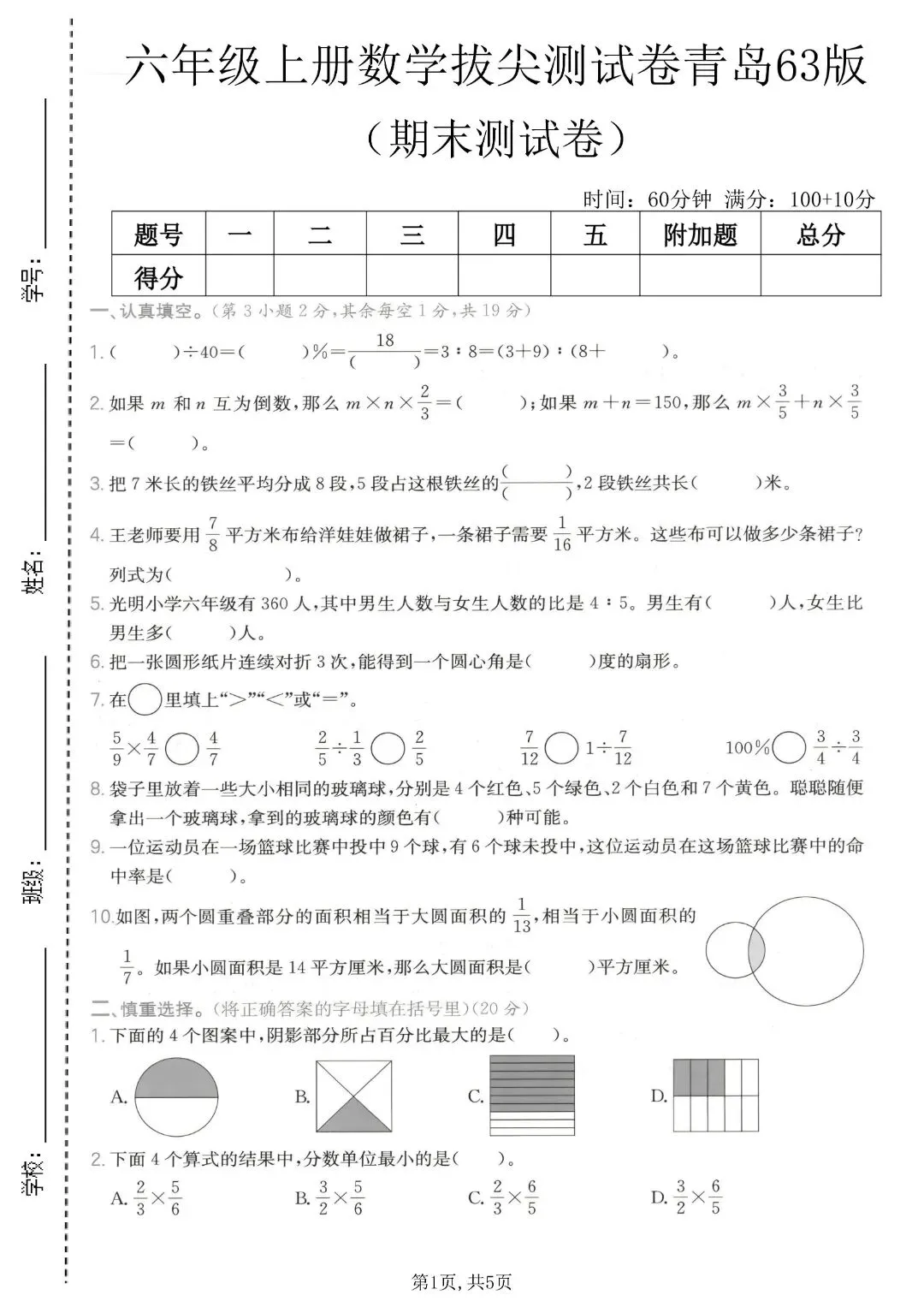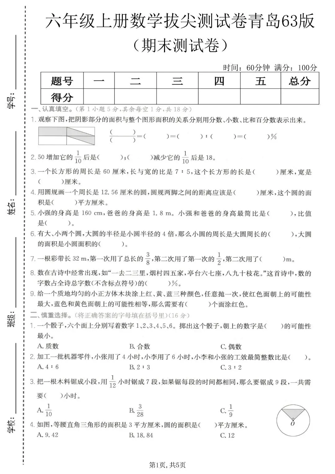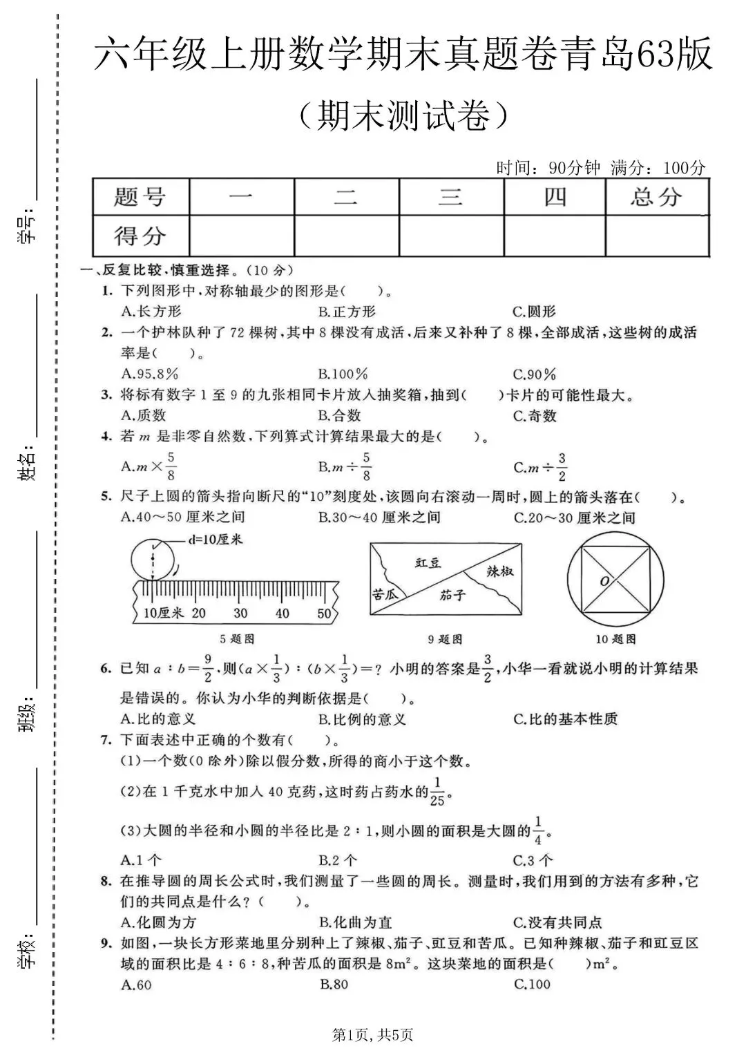 25新青岛63版六年级上册数学《期末测试卷》共12套含答案,完整高清电子版可打印