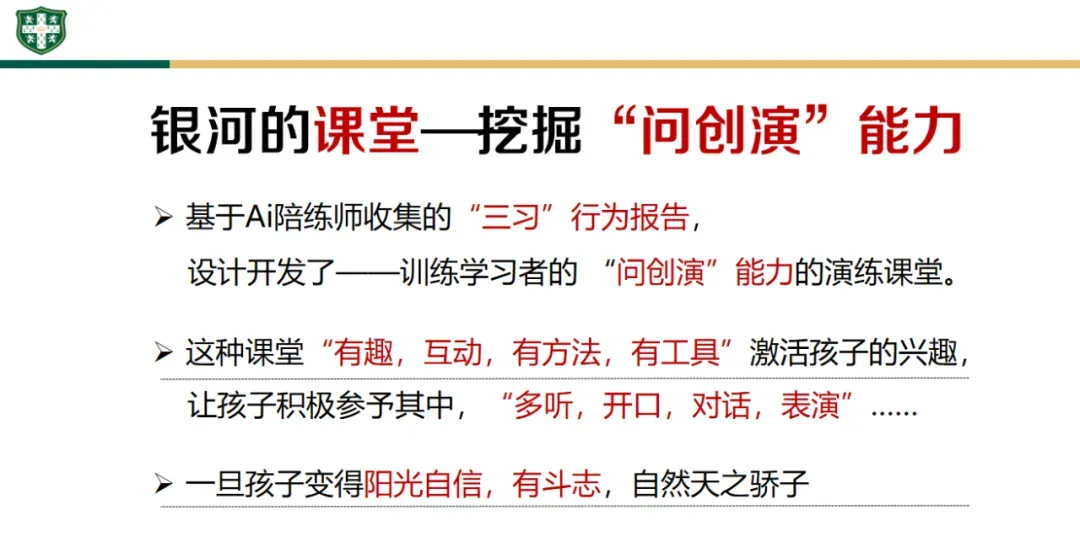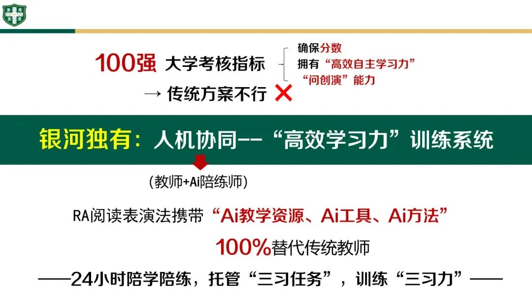l 银河学校首创Reading Arts(RA)阅读表演教学法,“先Reading,再Arting”先自学,再课堂。没有自学,不进课堂。