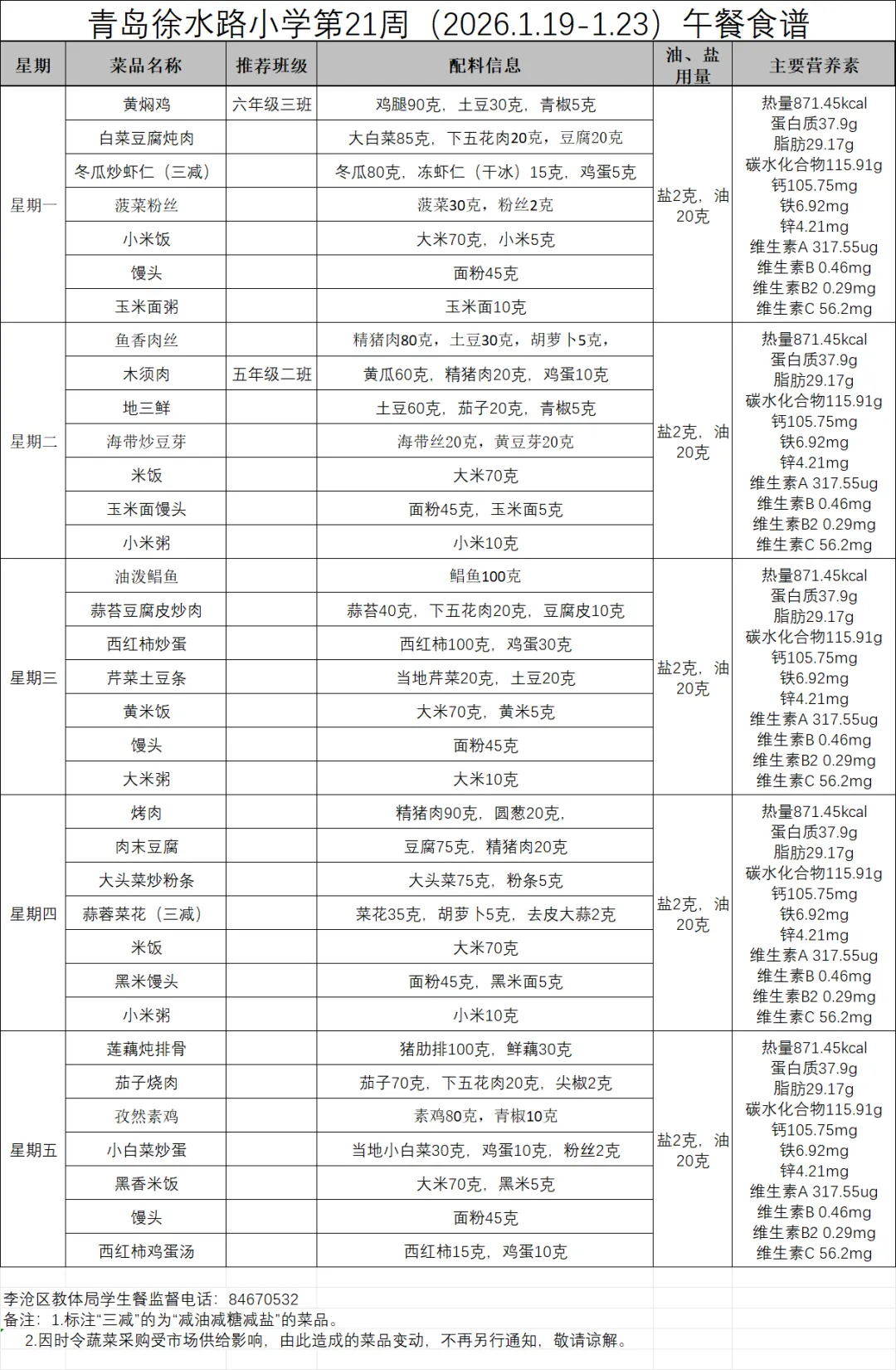青岛徐水路小学第21周(2026.1.19-1.23)午餐食谱