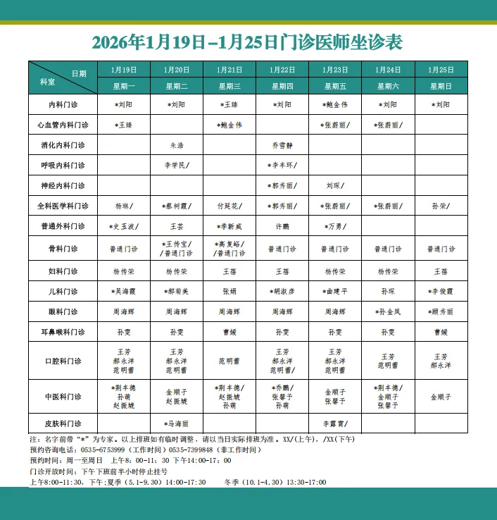 烟台高新技术产业开发区医院2026年1月19日—1月25日门诊医师坐诊表及专家信息