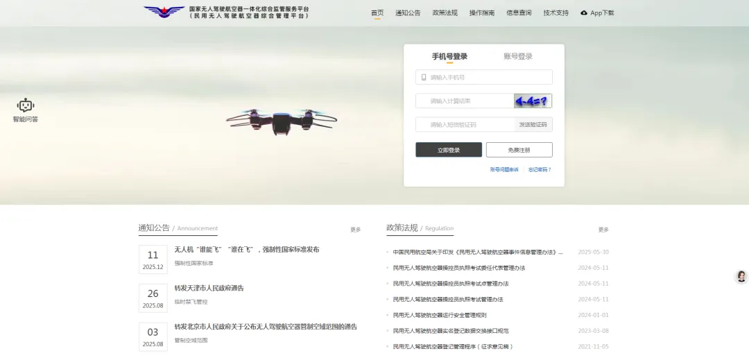 实名登记请各位飞手进入国家无人驾驶航空器一体化综合监管服务平台(民用无人驾驶航空器综合管理平台)网址:https://uas.caac.gov.cn