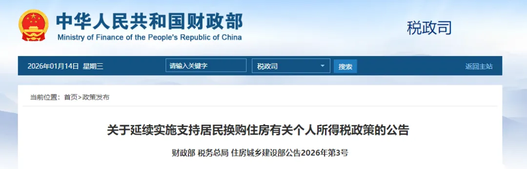 《公告》明确自2026年1月1日至2027年12月31日,对出售自有住房并在现住房出售后1年内在市场重新购买住房的纳税人,对其出售现住房已缴纳的个人所得税予以退税优惠。