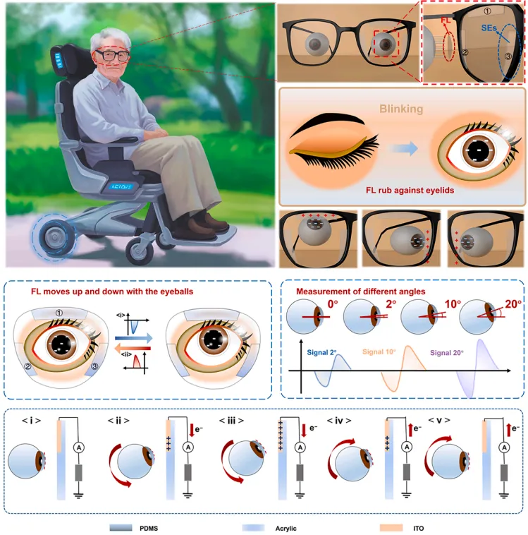 研究团队提出了一种基于摩擦纳米发电机的自供电眼动追踪系统,该系统核心包括附着于眼球表面的仿隐形眼镜式摩擦层和位于眼镜框架上的衬底电极矩阵。当使用者眨眼时,眼睑与摩擦层发生摩擦,使摩擦层表面积聚大量负电荷。当眼球向不同方向转动时,这些静电荷通过静电感应,在对应的衬底电极上产生可测量的感应电信号。通过处理这些信号,系统能够实时判断眼球运动的方向,实现了对眼动轨迹与幅度的双重检测。