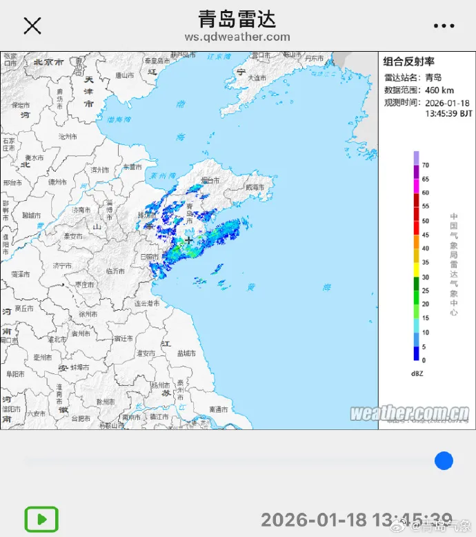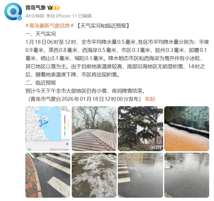 一、天气实况1月18日06时至12时,全市平均降水量0.5毫米,各区市平均降水量分别为:平度0.9毫米,莱西0.8毫米,西海岸0.5毫米,市区0.3毫米,胶州0.3毫米,即墨0.1毫米,崂山0.1毫米,城阳0.1毫米。降水相态市区和西海岸为雪并伴有小冰粒,其它地区以雪为主。由于目前地表温度较高,南部沿海地区无明显积雪,14时之后,随着地表温度下降,市区将出现积雪。预计今天下午全市大部地区仍有小雪,夜间降雪结束。(青岛市气象台2026年01月18日12时00分发布)【市防办、市水务局、市水文局、市气象局】降水量报告(毫米):1月18日06时至12时,全市平均降水量0.5,各区市平均降水量分别为:平度0.9,莱西0.8,西海岸0.5,市区0.3,胶州0.3,即墨0.1,崂山0.1,城阳0.1。今年以来全市累计降水量0.6,比去年同期多0.1,比历年同期少4.8。预计今天下午全市大部地区仍有小雪。