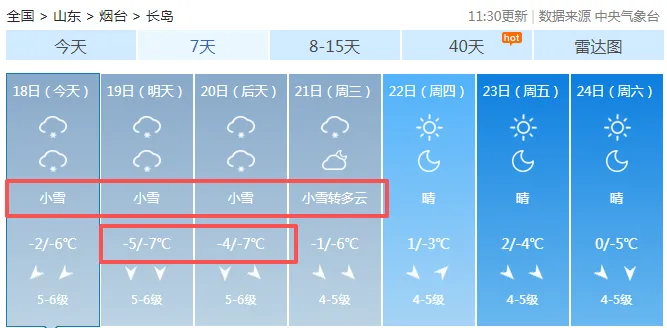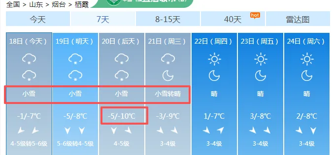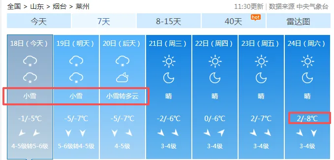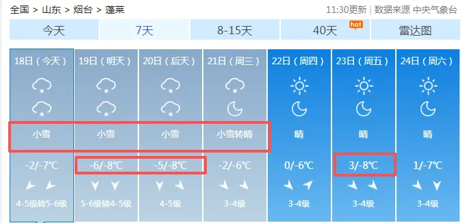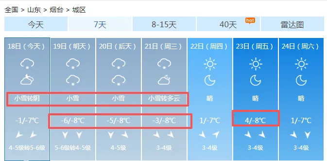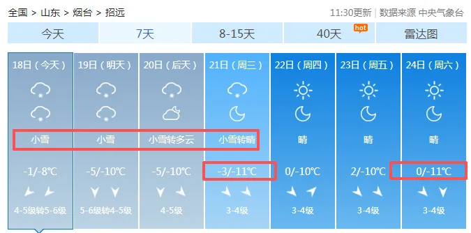 烟台市气象台1月18日11时继续发布寒潮蓝色预警、道路结冰黄色预警和大风警报:受冷空气影响,预计今天全市阴有小雪,19-21日,全市仍有间歇性小雪;气温较低,将出现对交通有影响的积雪和道路结冰,预计20-22日的最低气温,内陆地区-15~-10℃、沿海地区-10~-8℃;18-21日,偏北风,沿海海面最大风力7级阵风8~9级,陆地5~6级阵风7级。请注意防范。
