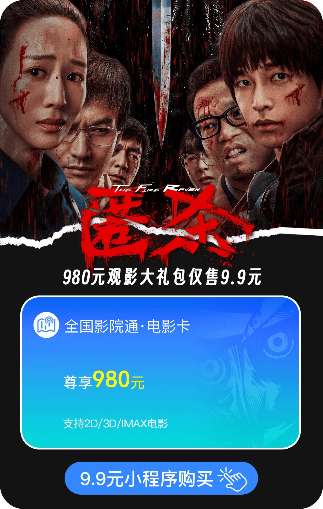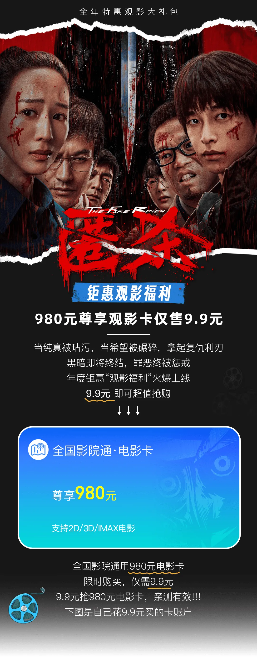 火爆抢购全国影院通用980元电影卡抢购价:9.9元 / 原价99元