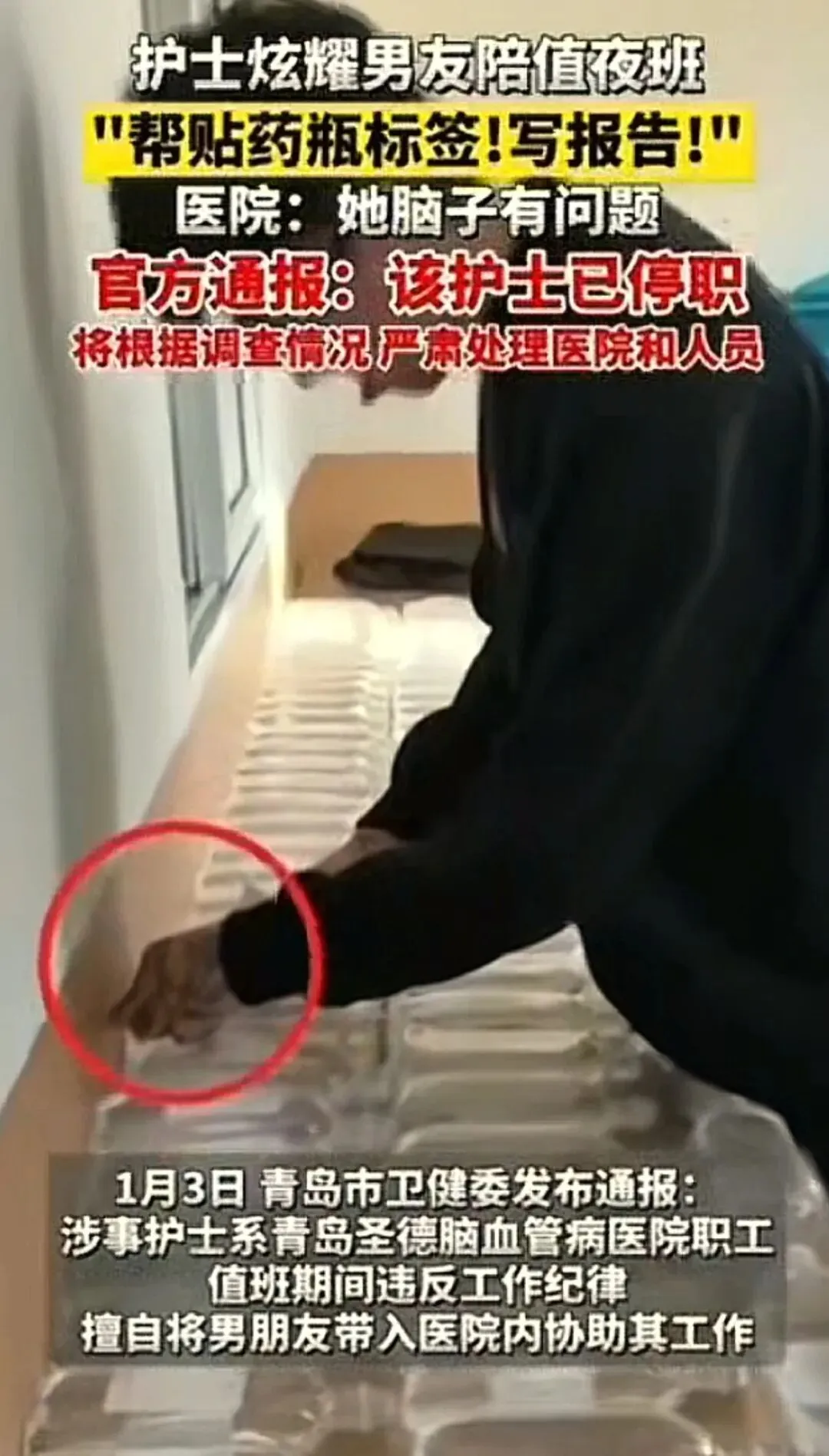 到了1月3日,青岛市卫健委发了通报。内容很短,但很硬:涉事护士确实在青岛圣德脑血管病医院工作,因违反纪律,擅自带男友进工作区协助操作,已被停职。卫生监督部门已介入,后续要依法追责,医院也跑不掉。