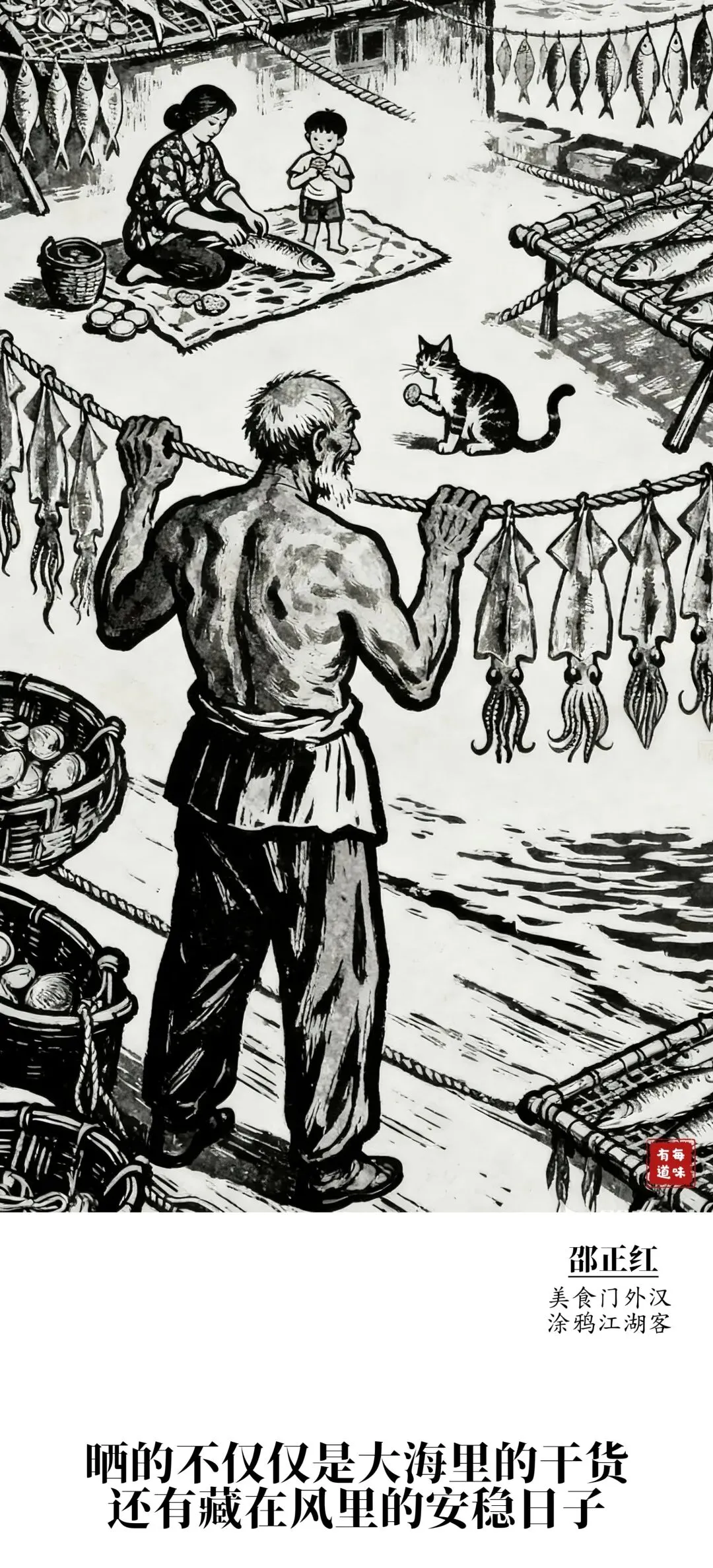 晒乌贼干,是胶东渔家的老手艺。乌贼又叫墨鱼,因能吐墨得名。刚上岸的大乌贼,得在海水里反复搓洗,抠净墨囊,刮掉身上黏腻,撒把盐腌上半日。盐粒渗进肉里,麻绳穿过乌贼头,往屋檐下一串,就等着晒干收存。