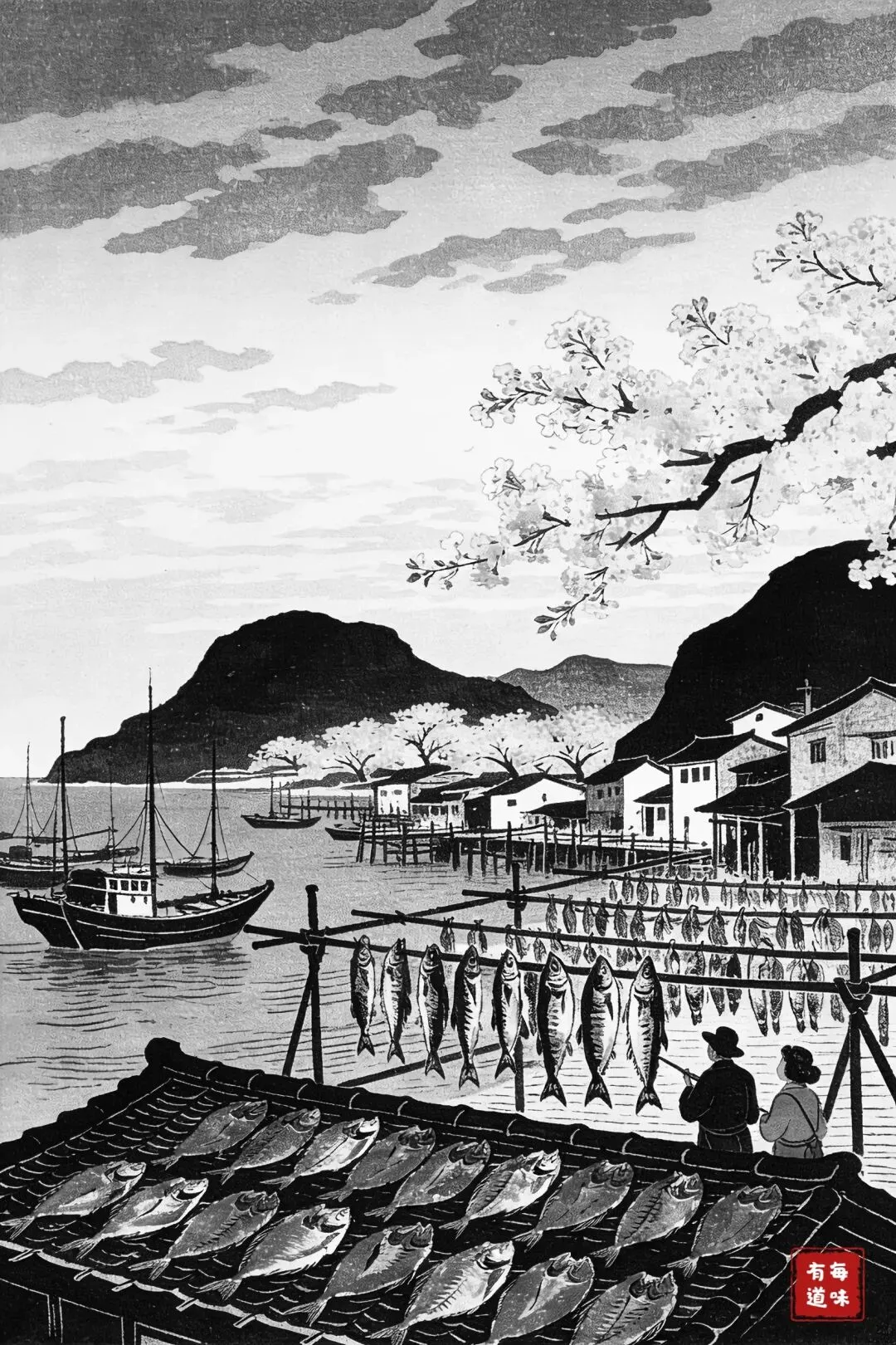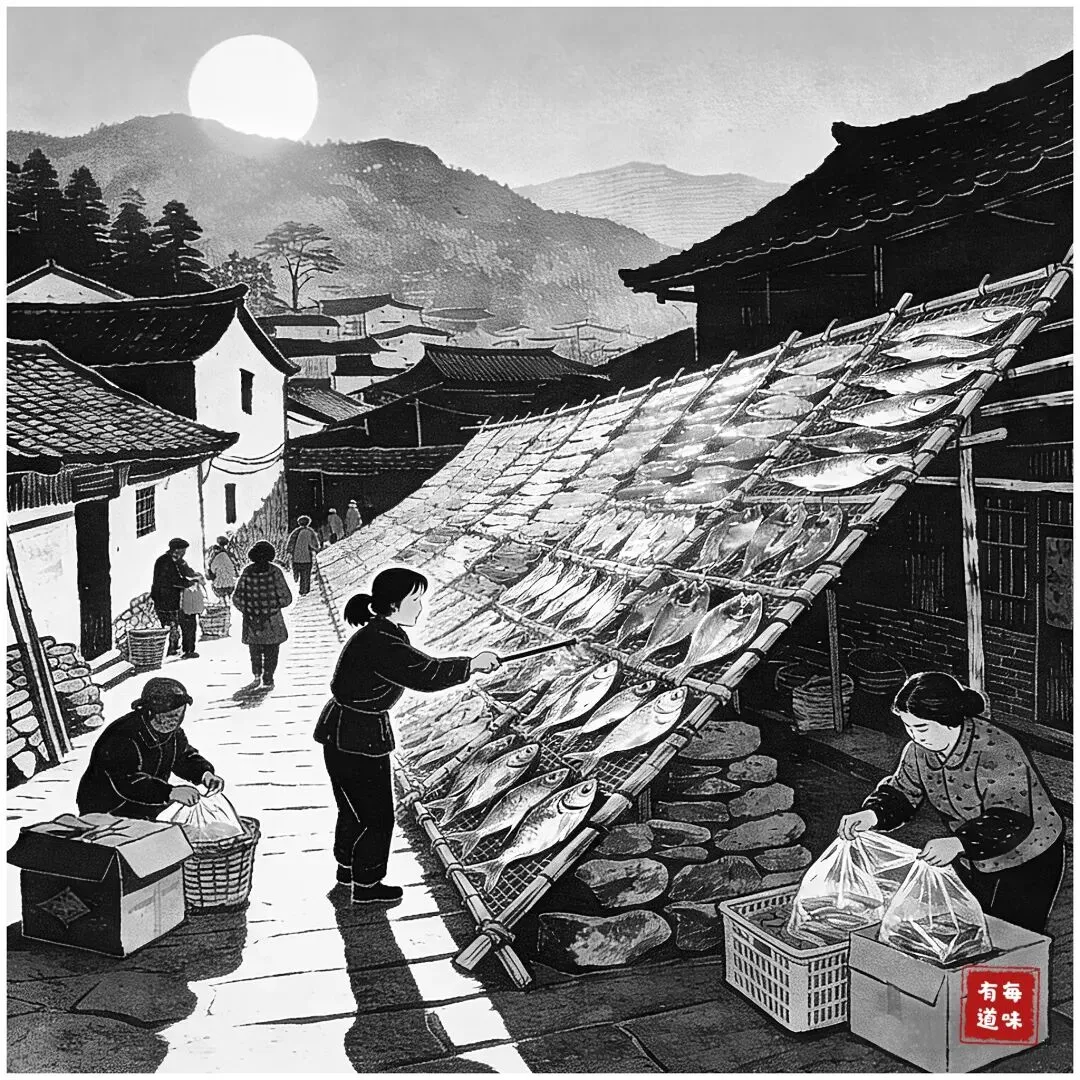 我沿着村里的主路慢慢走,暖阳裹着鱼干的咸香扑面而来。心里却想着,等到春暖,梅花次第绽放,小山漫笼樱粉,屋顶上依旧摆着一排排褐红的鱼干,那景致,该有多好。