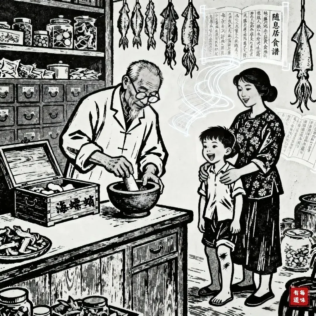 这乌贼干最是耐放,搁在阴凉处,放个一年半载,鲜味丝毫不减,是渔家灶台上常年不离的“好物件”。《随息居饮食谱》有载:“乌贼疗口咸,滋肝肾,补血脉,理奇经。”就连乌贼的骨头也有用,名叫海螵蛸,能治跌打出血。