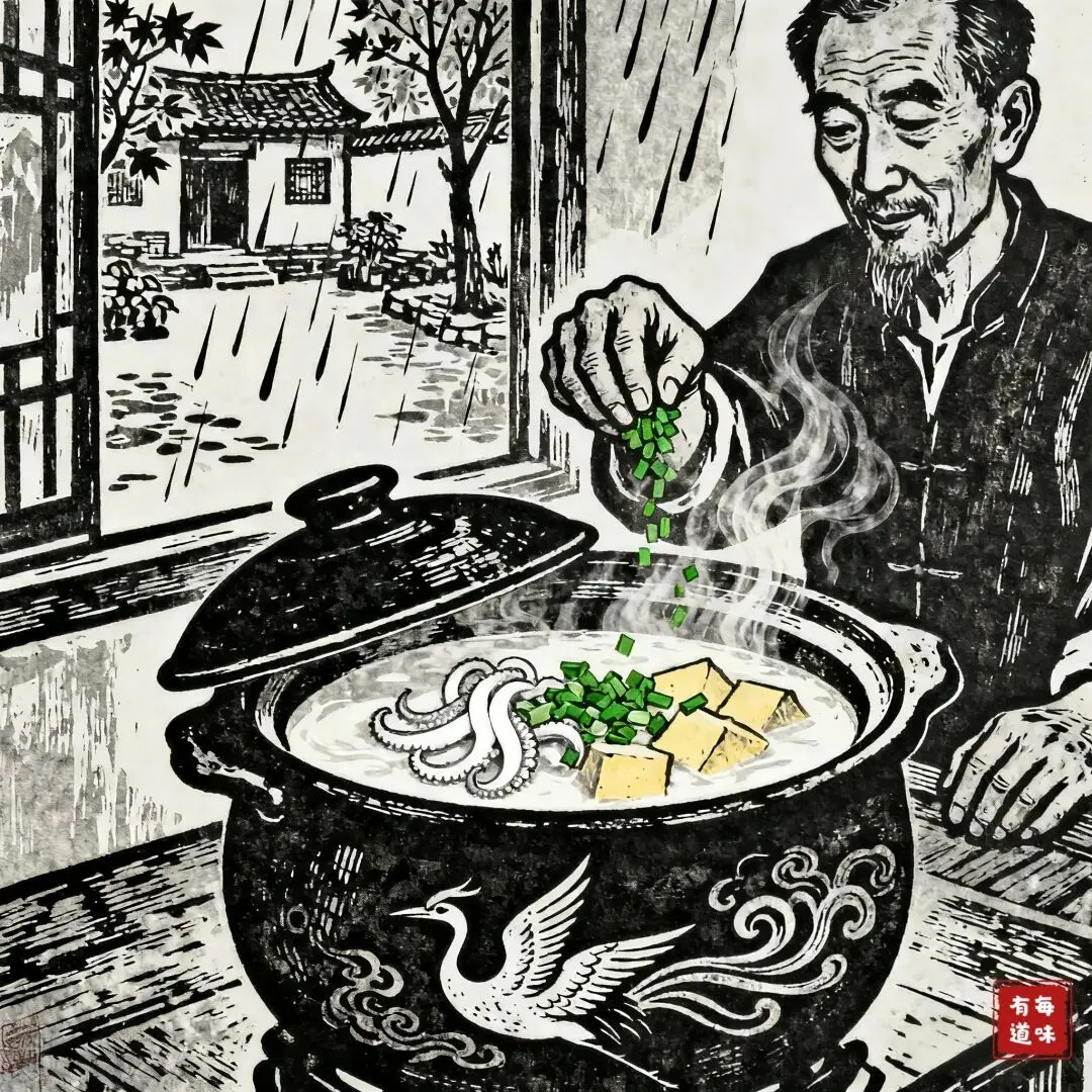 乌贼干须提前用温水泡发,剔净内脏滑膜,切成长条备用。炖豆腐最是鲜醇。卤水嫩豆腐切厚块,盐水浸五分钟去豆腥。葱姜炝锅,下乌贼干翻炒出香,添热水没过,大火烧开,转小火咕嘟一刻钟,再下豆腐慢炖十分钟。撒盐、白胡椒粉,最后抛一把小葱花。掀盖时,豆腐微黄莹润,乌贼干韧弹入味,热汤一喝,浑身舒泰。