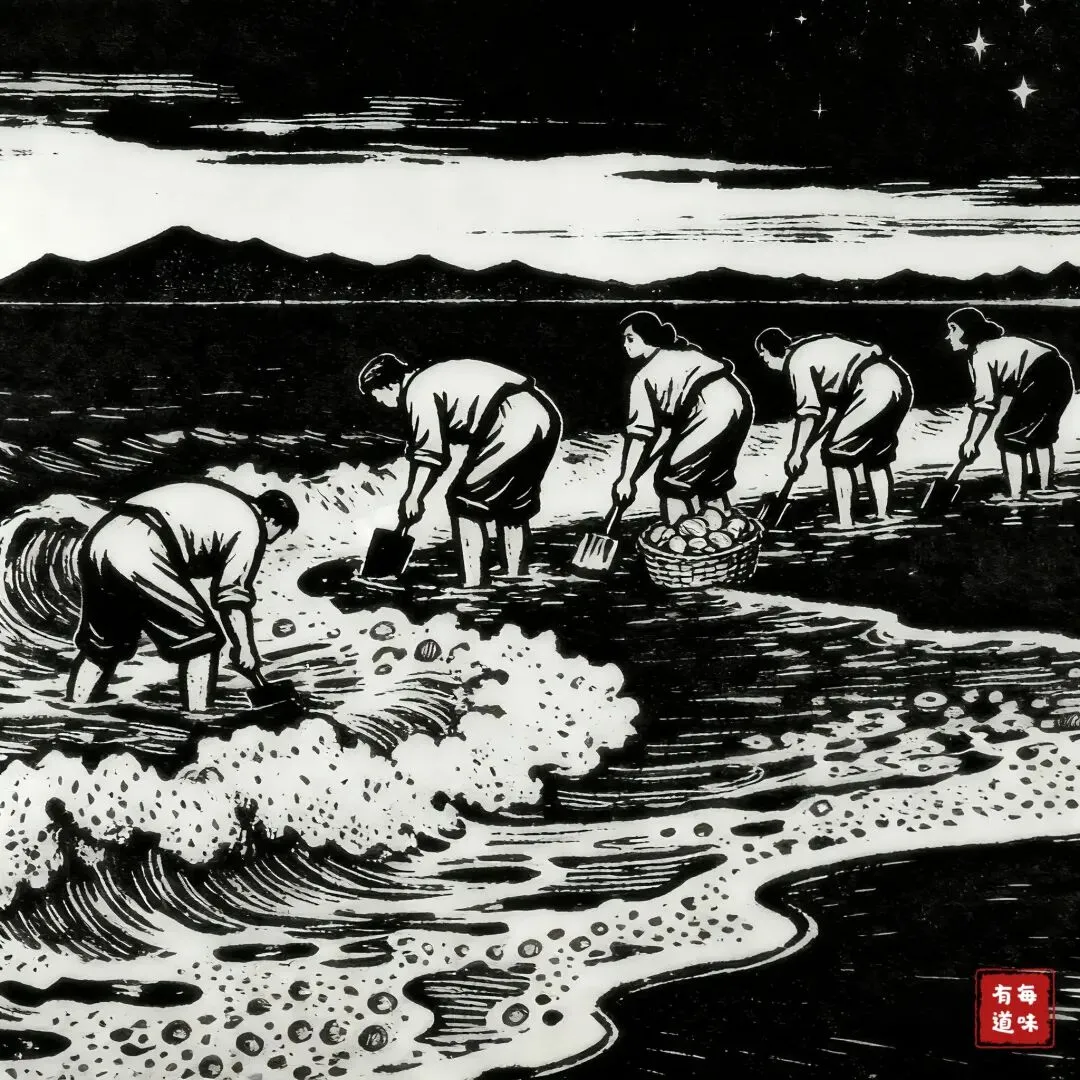 干蛤蜊肉的味,也格外好。记得小时候,初夏最盼两件事:一是赶海大潮,二是姥姥晒干蛤蜊肉。刚入夏,蛤蜊还算肥,赶上落大潮,村里人提着篓子、结伴往沧口大江口赶,挖一整夜蛤蜊,清晨扛着满篓子蛤蜊往回走。街上摆摊的,蛤蜊也卖得便宜,几毛钱就能买一大筐。