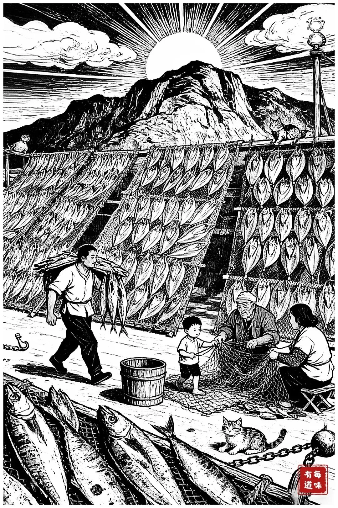晒处倒不讲究。檐下、绳上、网架、平房、红瓦屋顶,皆可。风要干爽,日头要温,别太烈。晒上两三天,鱼身收紧,带点韧劲儿,皮肉还润着,成了。