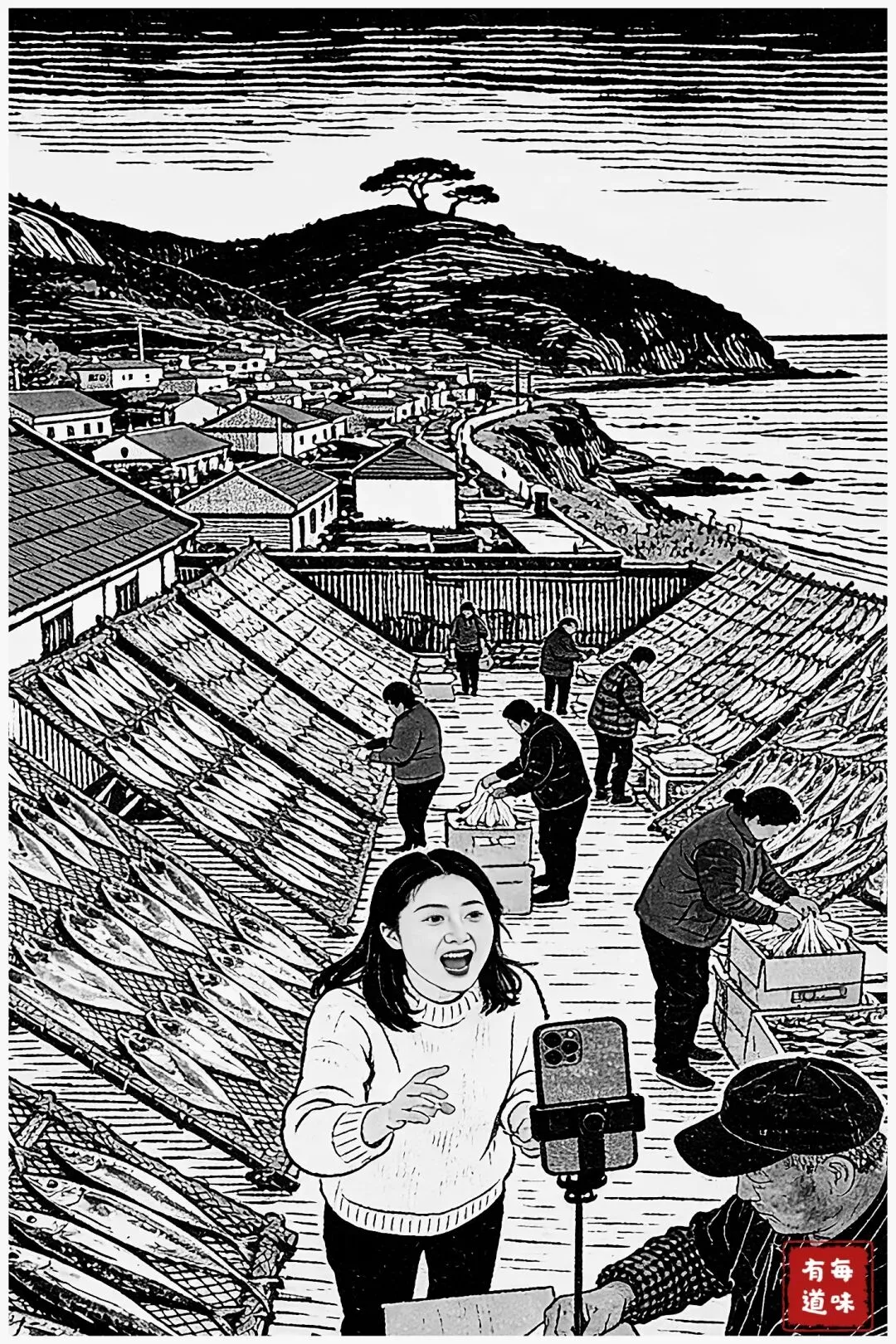 放眼望去,村民的屋顶上、院子里,都支着宽三丈、长五丈的晒鱼架。为了好晾干,架子都朝着太阳,四十五度斜着放。网架摆满各色甜晒鱼。鲅鱼、鳗鳞、鼓眼、舌头鱼,在日光里泛着诱人光泽。有人在镜头前高声吆喝着直播卖货,姑娘的声音亮堂堂的;大叔大嫂们则忙着抽空封袋、装箱发货,指尖翻飞,人来人往,一派繁忙。