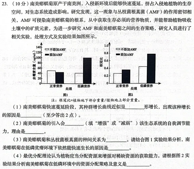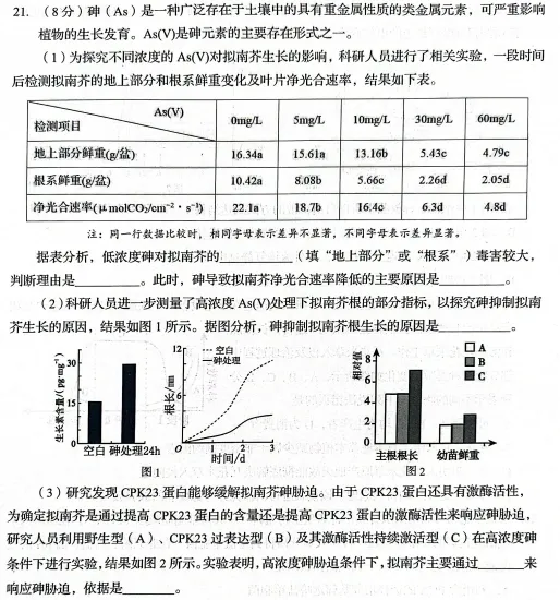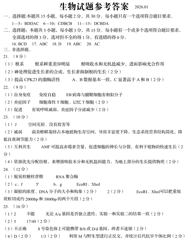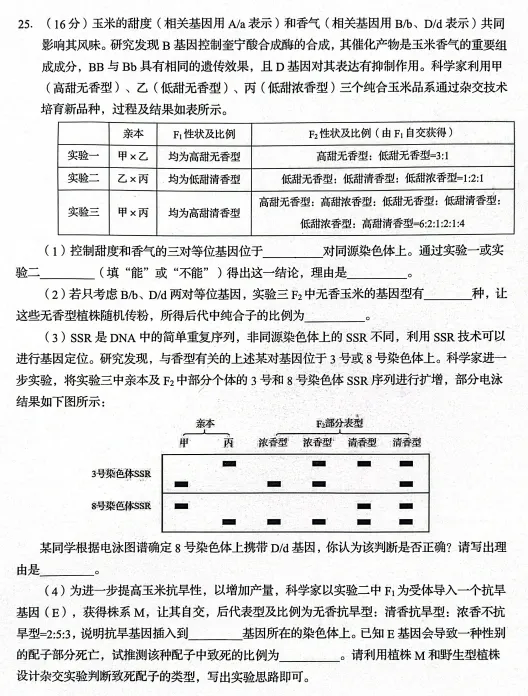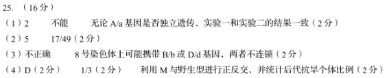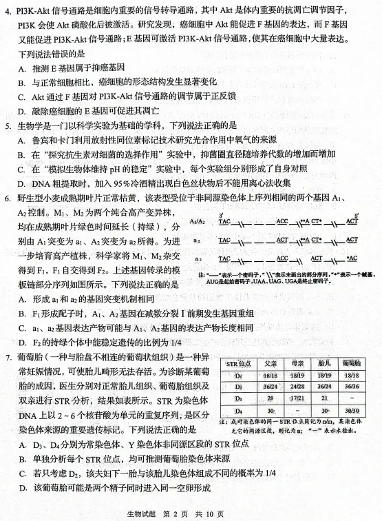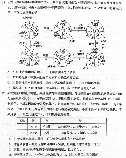 还是那句话,生物老师/生命科学工作者/CNBOers/学生物的同学们如果在文中发现了问题,欢迎随时留言指正!后期的更正内容会在评论区置顶!如果遇到了,请将“细胞质基质”替换为“细胞溶胶”,“糖原”替换为“糖元”,“3.9-6.1mmol/L”替换为“0.8-1.2g/L”,“斐林试剂”替换为“本尼迪特试剂”等。❤️特别感谢青岛二中理工MT的“奥一”同学!发预告的时候忘记打署名了……这次我们获得了完整的题干,不需要额外补齐啦。然后进入正题。这次我们决定一页一页地放题,不至于像上次一样一道题一道题地翻图片了。由于时间仓促,所以本次单选题直接发关键选项的解析。1.B项错误,任何蛋白质的合成都是在细胞质基质内完成的。2.D项错误,题干提到了氢离子浓度梯度,再加上转运蛋白对两种离子的转运方向相反,所以氢离子是泵出液泡的,则pH(液泡)<pH(基质)。3.A项错误,二氧化碳内的氧元素也有来自水的成分;B项错误,酶不能供能;C项错误,结构类似的应该是丙二酸和琥珀酸。4.A项错误,在癌细胞中大量表达的应该是原癌基因,如果E基因是抑癌基因,那癌细胞死翘翘了!5.A项错误,18-O是稳定同位素;B项错误,培养代数越多,耐药菌占比就越大,抑菌圈会越来越小;D项错误,这一步不仅是该实验第二个离心步骤,还是该实验唯一一个离心后要弃上清液的步骤。6前序分析.既然两个M都是纯合高产变异株,两个基因还在非同源染色体上,那么Aa突变组合是不可能的了,应该是AAaa突变组合。6选项分析.A项错误,形成a1的原因是ACC替换为ACT,形成a2则是丢失了两个碱基对;B项错误,减数分裂中非同源染色体基因重组发生在减数分裂I后期;D项错误,M1的基因型A1A1a1a1,M2的基因型为A2A2a2a2,那么F1就是A1A2a1a2,F2中持绿个体必然携带a1a1或a2a2,可以稳定遗传,无需计算概率。7.A项错误,父亲的D3只有一条,还具有母亲没有的D4,D3不是X是什么?B项错误,来源没法确定;C项错误,D2的组合方法有36/24、36/28、24/24、24/28四种,概率应该是¾。