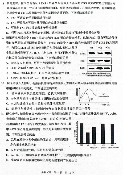 8.A……你家基因突变能用光学显微镜观测到?C项错误,FXS是伴X隐性遗传,女性患者患病率远小于男性患者(这个病其实在我看来考频有一点高了,所以索性记住了); D选项错误,适当升高复性温度才是减少非特异性扩增的办法。