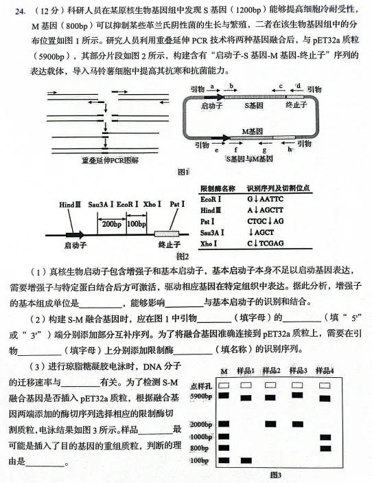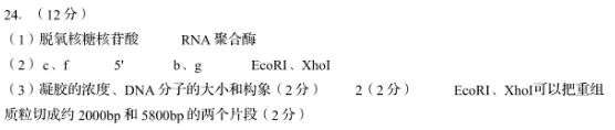 23(1)的第二个空答食物充裕也是可以的。(3)第一个空经常有写成原始合作的,不得分哦。24题整体篇幅很大,留意(2)的第二个空,二蒙一也要优先蒙5'端哦。相比于山东省实验近期的一道生物题(下周会发!),这题算是非常良心的了,我第一次做就把17/49算出来了,好嗨森~时间所迫,这次的质量大幅下滑,在此给各位道个歉!有任何问题都可以评论区或私信留言!